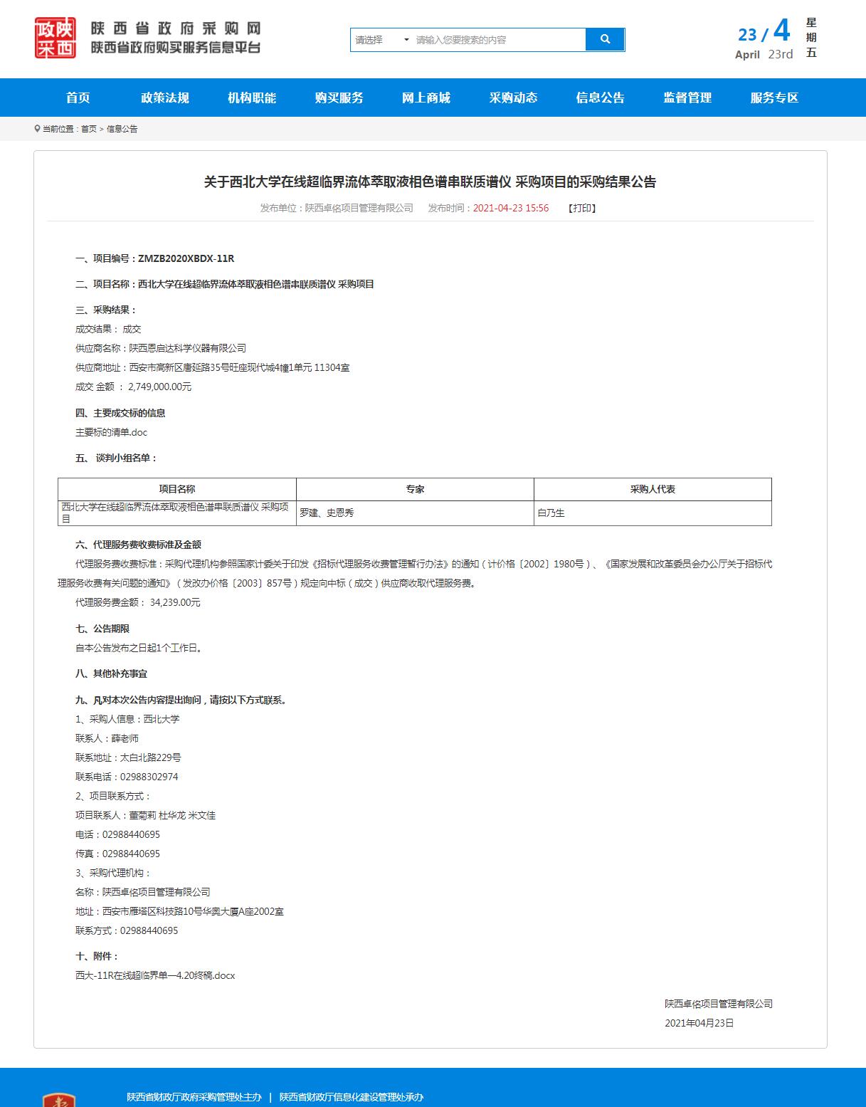 MILAN.COM在线超临界流体萃取液相色谱串联质谱仪 采购项目的采购结果公告