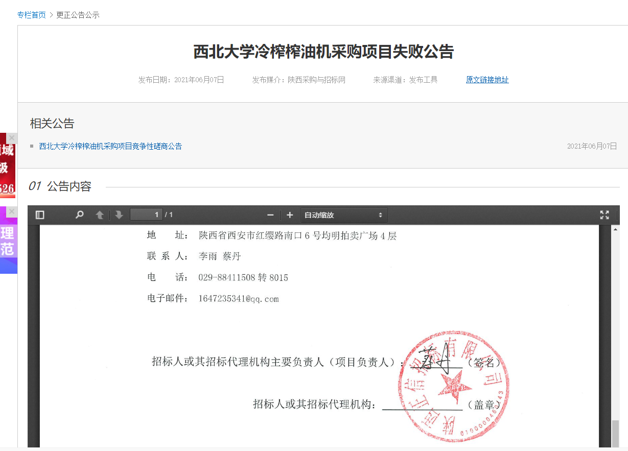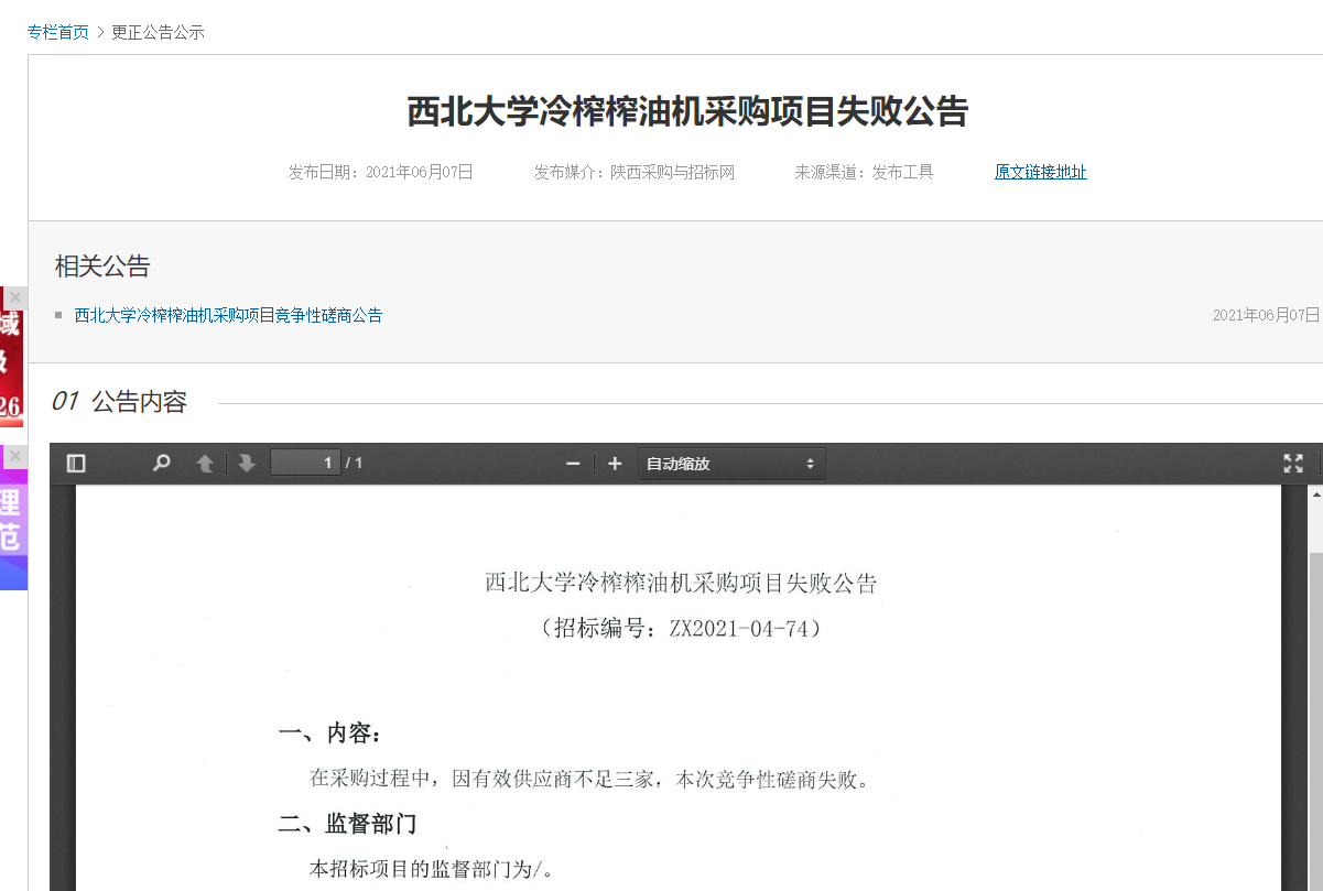 MILAN.COM冷榨榨油机采购项目失败公告 作者: 编辑:薛利娟 时间:2021-06-07 原公告地址:http://bulletin.sntba.com/changeBulletin/2021-06-07/305152.html