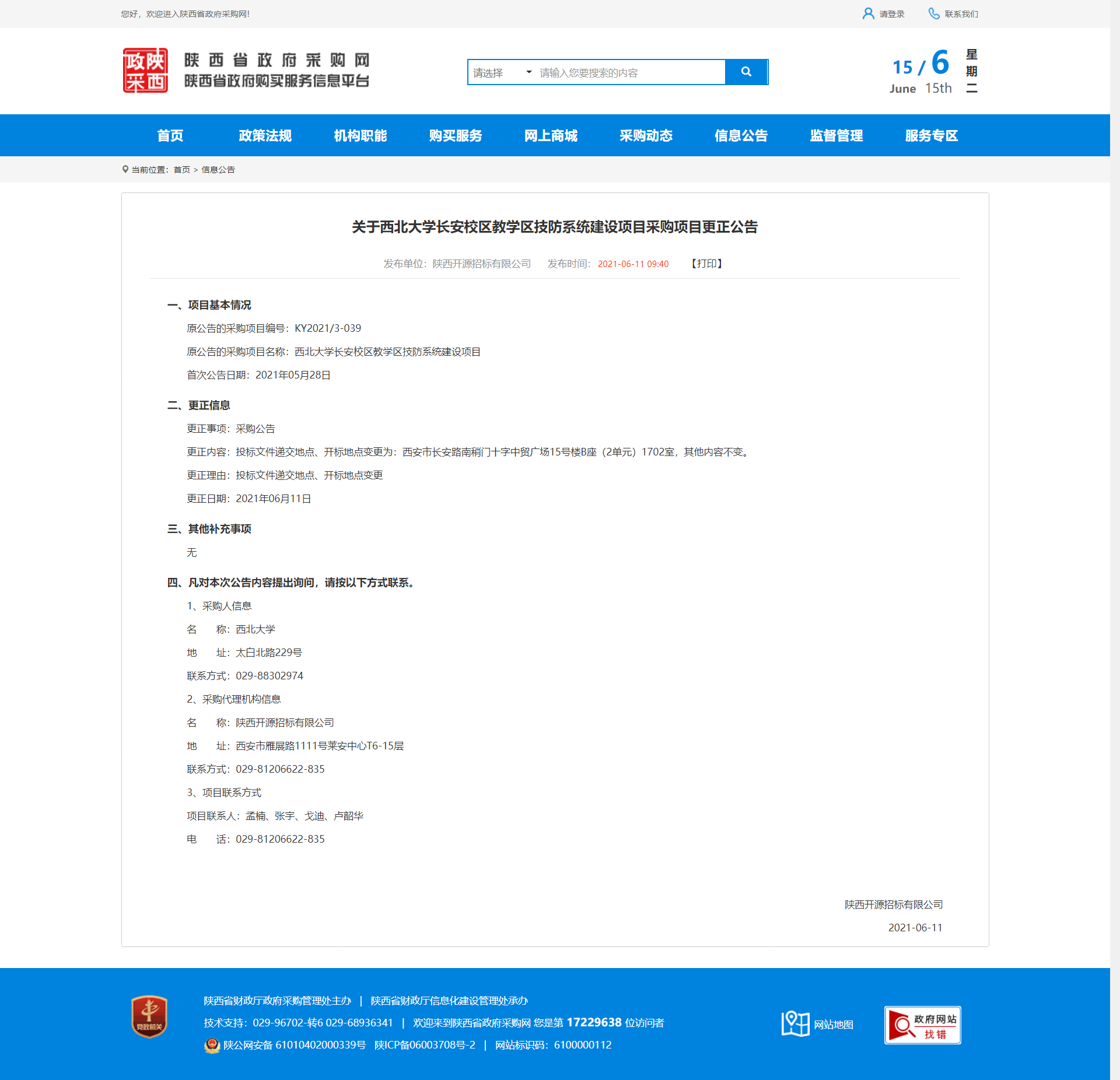 关于MILAN.COM长安校区教学区技防系统建设项目采购项目更正公告 作者: 编辑:薛利娟 时间:2021-06-15 原公告地址:http://www.ccgp-shaanxi.gov.cn/notice/noticeDetail.do?noticeguid=8a85be33791baa0f0179f8ab30151d42