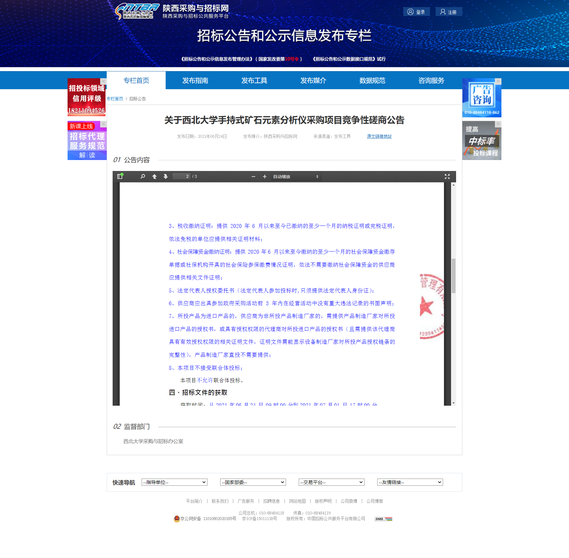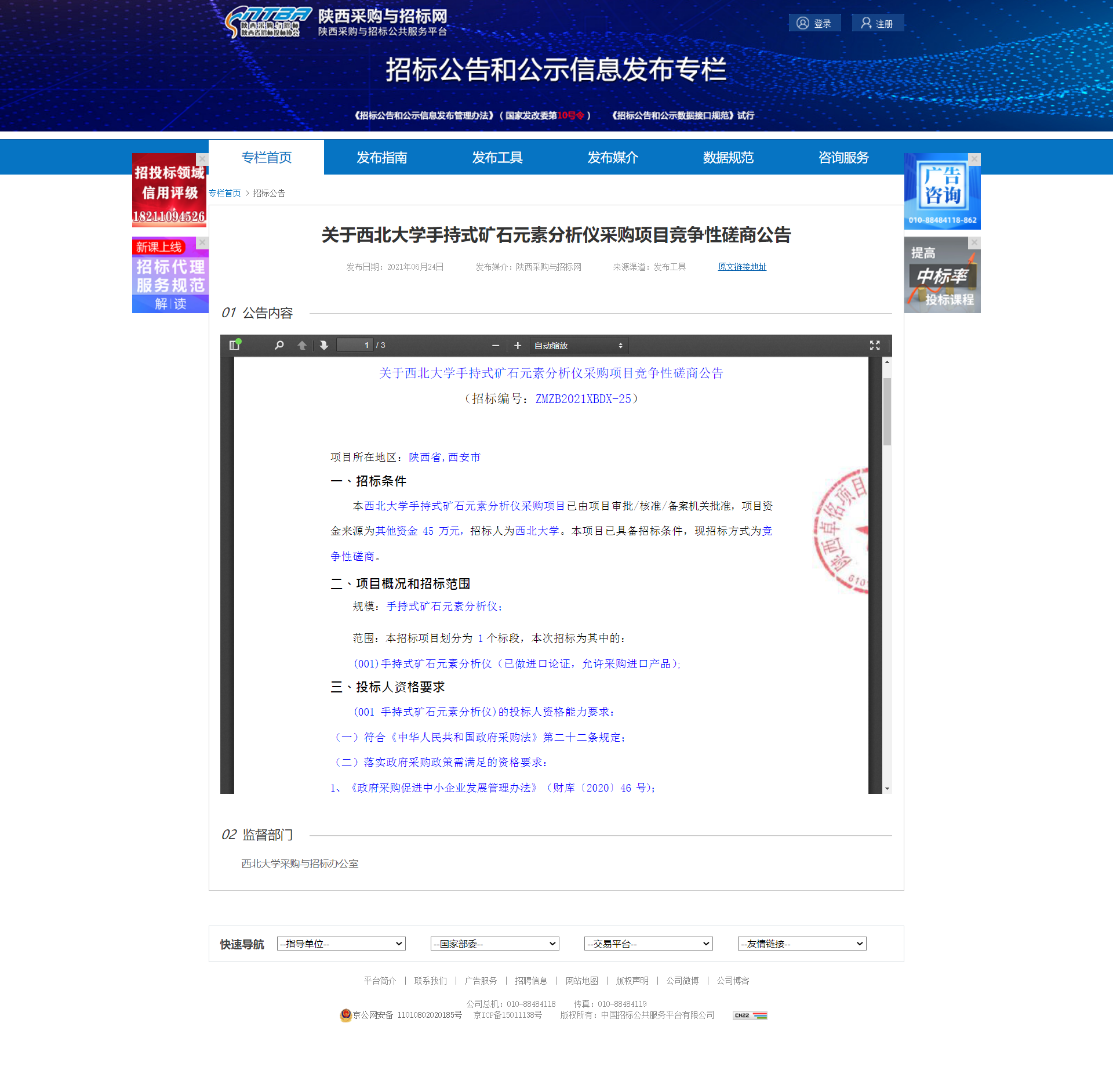 MILAN.COM手持式矿石元素分析仪采购项目竞争性磋商公告 作者: 编辑:薛利娟 时间:2021-06-24 原公告地址:http://bulletin.sntba.com/biddingBulletin/2021-06-24/311501.html