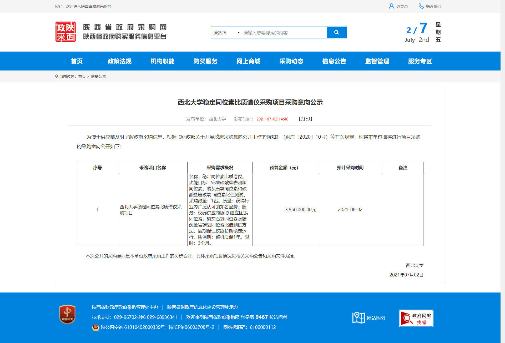 MILAN.COM稳定同位素比质谱仪采购项目采购意向公示 作者: 编辑:采购与招标办公室 时间:2021-07-02 原公告地址:http://www.ccgp-shaanxi.gov.cn/notice/noticeDetail.do?noticeguid=8a85be317a51dcbc017a65e4a5e21daf