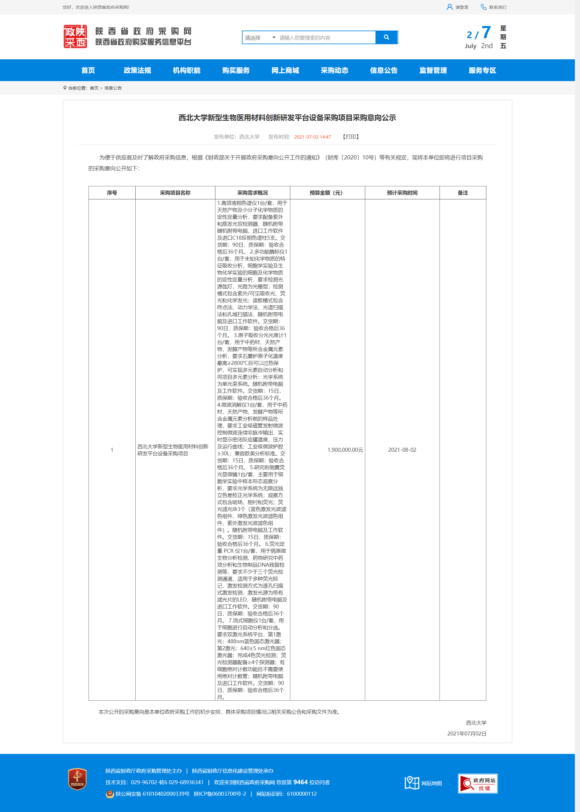 MILAN.COM新型生物医用材料创新研发平台设备采购项目采购意向公示 作者: 编辑:采购与招标办公室 时间:2021-07-02 原公告地址:http://www.ccgp-shaanxi.gov.cn/notice/noticeDetail.do?noticeguid=8a85be317a51dcbc017a65f4bbc71f16