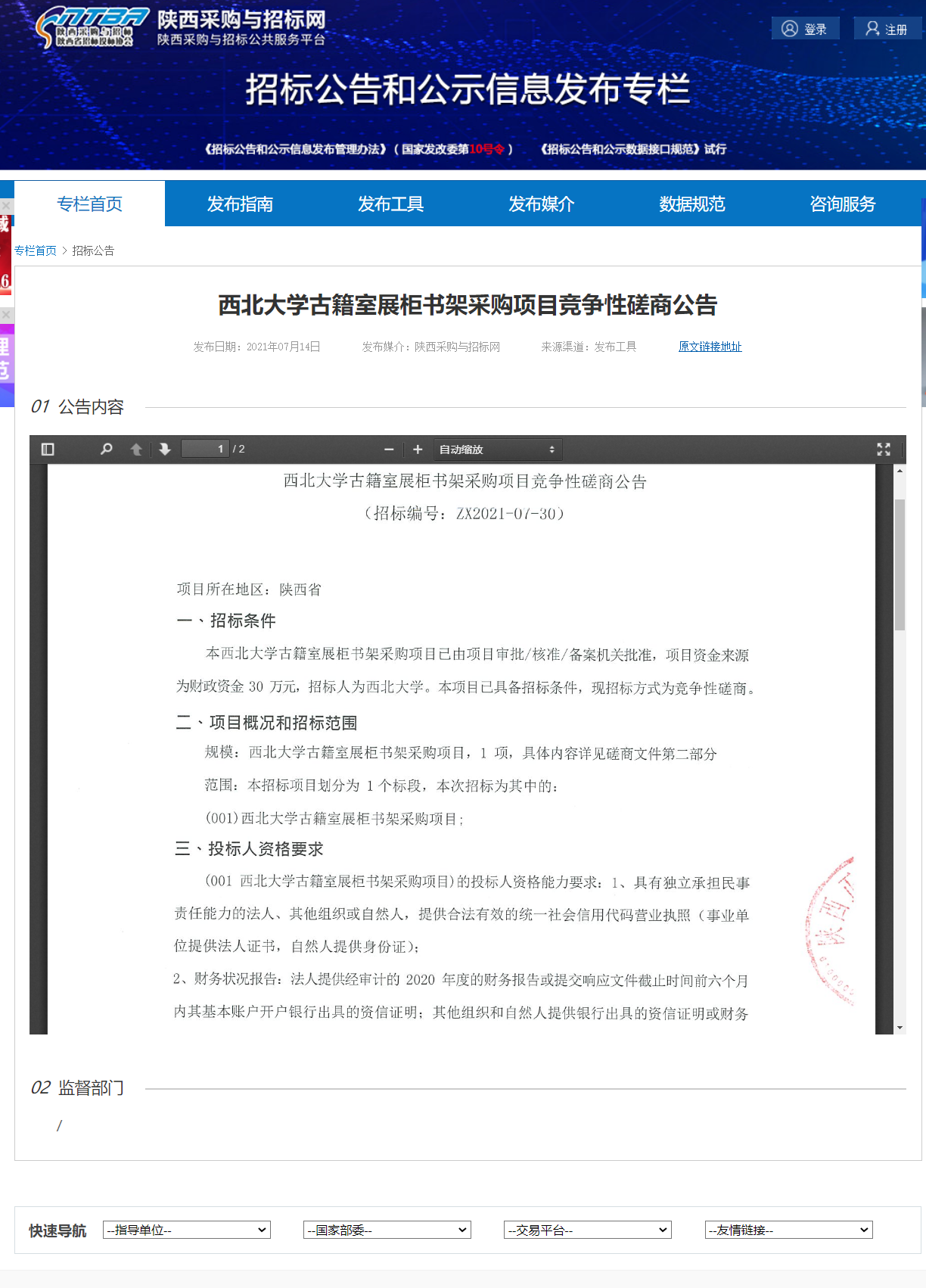 MILAN.COM古籍室展柜书架采购项目竞争性磋商公告 作者: 编辑:采购与招标办公室 时间:2021-07-15 原公告地址:http://bulletin.sntba.com/biddingBulletin/2021-07-14/318898.html