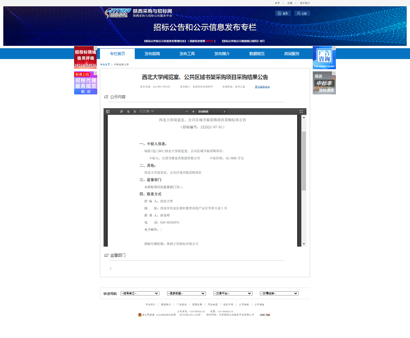 MILAN.COM阅览室、公共区域书架采购项目采购结果公告 作者: 编辑:采购与招标办公室 时间:2021-07-26 原公告地址:http://bulletin.sntba.com/resultBulletin/2021-07-26/323301.html