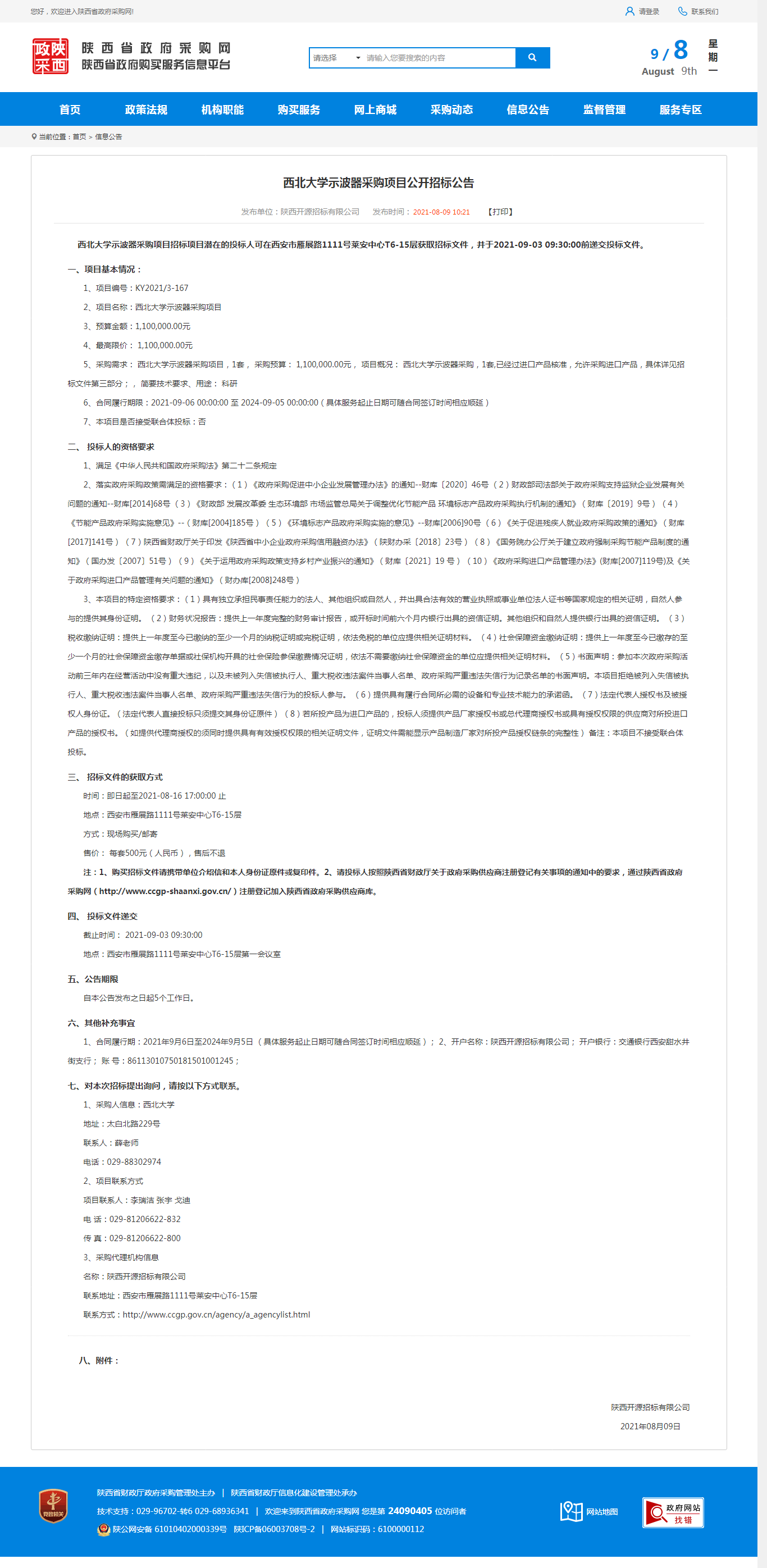MILAN.COM示波器采购项目公开招标公告 作者: 编辑:采购与招标办公室 时间:2021-08-09 原公告地址:http://www.ccgp-shaanxi.gov.cn/notice/noticeDetail.do?noticeguid=8a85be347b04610d017b28a3aa0f0939