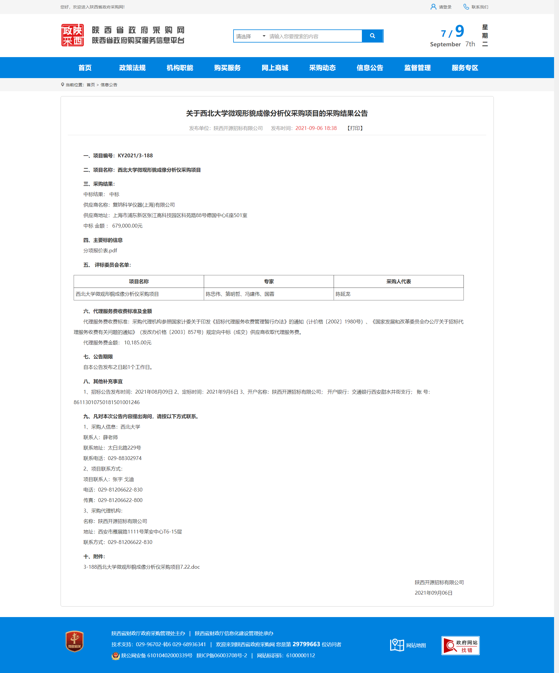 关于MILAN.COM微观形貌成像分析仪采购项目的采购结果公告 作者: 编辑:采购与招标办公室 时间:2021-09-07 原公告地址:http://www.ccgp-shaanxi.gov.cn/notice/noticeDetail.do?noticeguid=8a85be347b04610d017bbaac92114f2e