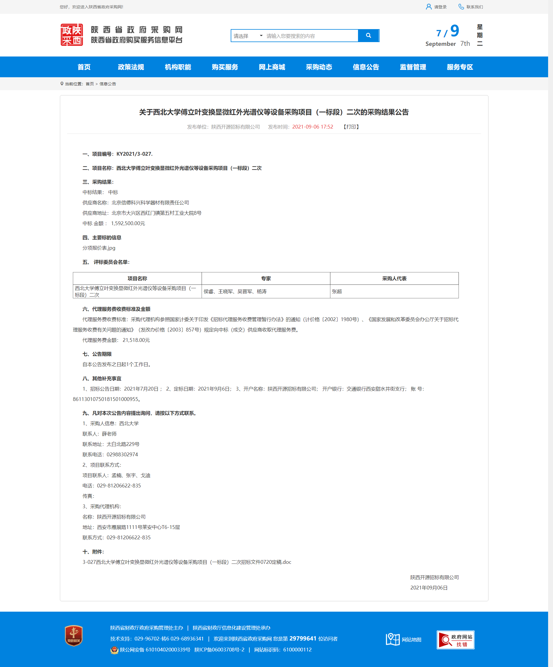 关于MILAN.COM傅立叶变换显微红外光谱仪等设备采购项目(一标段)二次的采购结果公告 作者: 编辑:采购与招标办公室 时间:2021-09-07 原公告地址:http://www.ccgp-shaanxi.gov.cn/notice/noticeDetail.do?noticeguid=8a85be347b04610d017bba8364b14d06