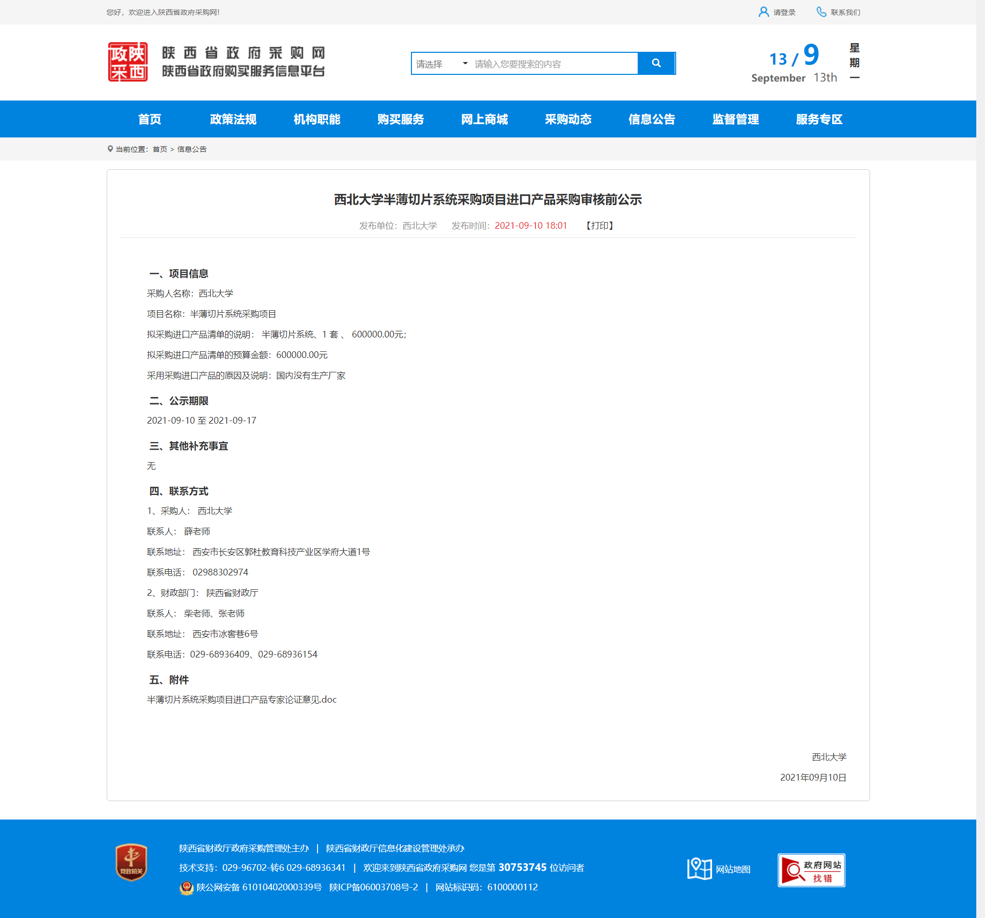 MILAN.COM半薄切片系统采购项目进口产品采购审核前公示 作者: 编辑:采购与招标办公室 时间:2021-09-13 原公告地址:http://www.ccgp-shaanxi.gov.cn/notice/noticeDetail.do?noticeguid=8a85be347bc00296017bcf143b49100c