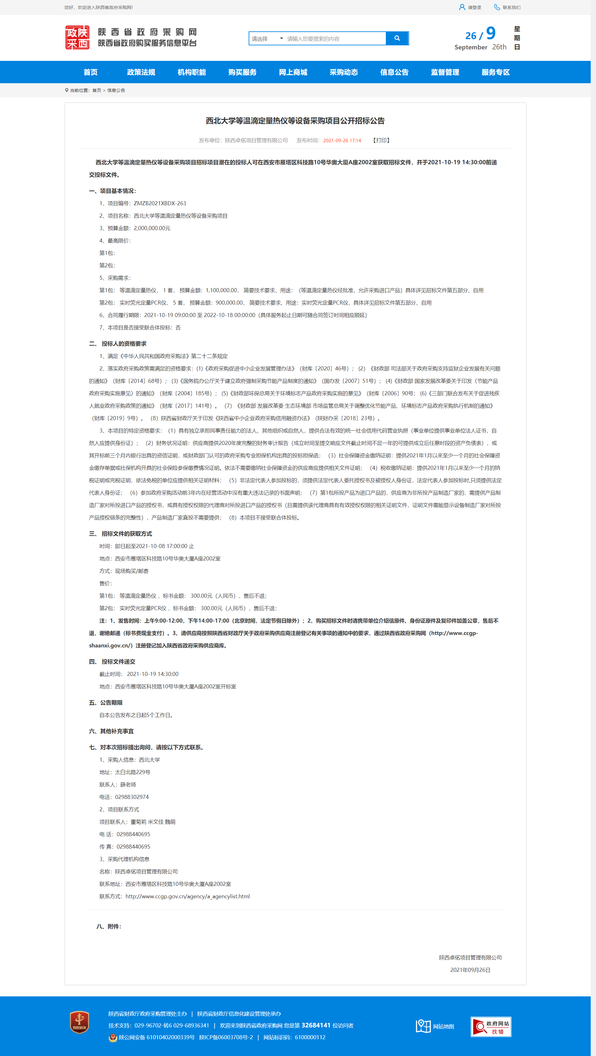 MILAN.COM等温滴定量热仪等设备采购项目公开招标公告 作者: 编辑:采购与招标办公室 时间:2021-09-26 原公告地址:http://www.ccgp-shaanxi.gov.cn/notice/noticeDetail.do?noticeguid=8a85be317c20d707017c21545fc51220