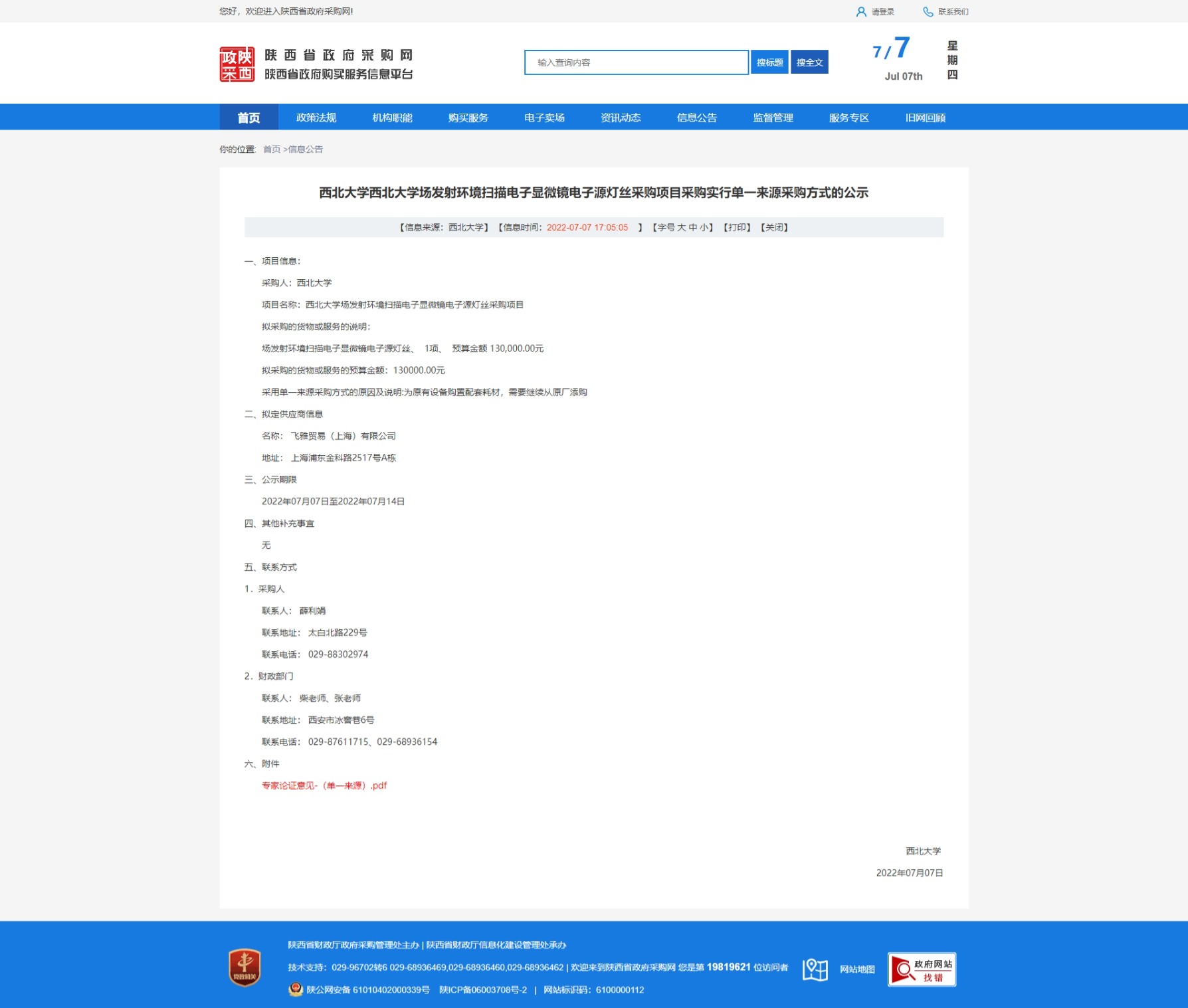 MILAN.COM场发射环境扫描电子显微镜电子源灯丝采购项目采购实行单一来源采购方式的公示 作者: 编辑:薛利娟 时间:2022-07-07 原公告链接:http://www.ccgp-shaanxi.gov.cn/freecms/site/shaanxi/ggxx/info/2022/8a69c98381d796930181d7db0fcb3096.html?noticeType=001051¬iceId=3e7bb0b7-fdd4-11ec-9a8e-08c0eb20c666