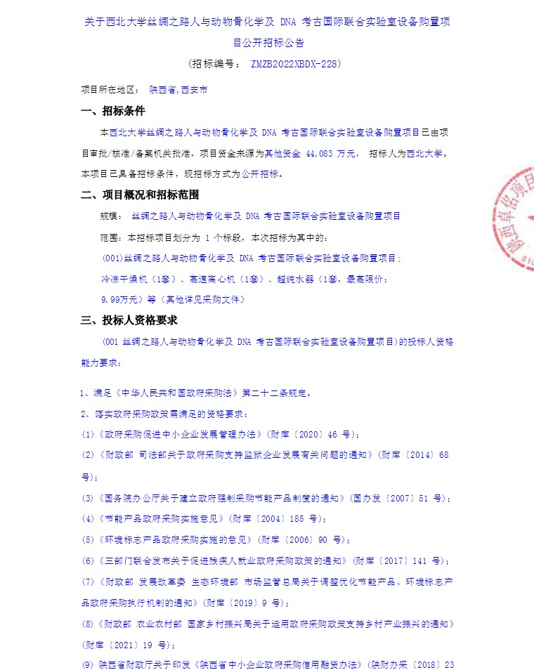 关于MILAN.COM丝绸之路人与动物骨化学及DNA考古国际联合实验室设备购置项目公开招标公告