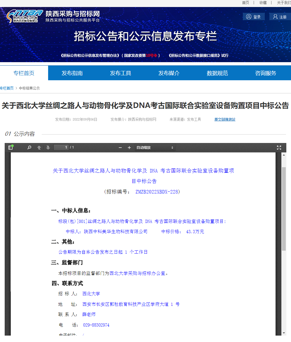 关于MILAN.COM丝绸之路人与动物骨化学及DNA考古国际联合实验室设备购置项目中标公告 作者: 编辑:采购与招标办公室 时间:2022-09-06 原公告链接:http://bulletin.sntba.com/resultBulletin/2022-09-06/470905.html