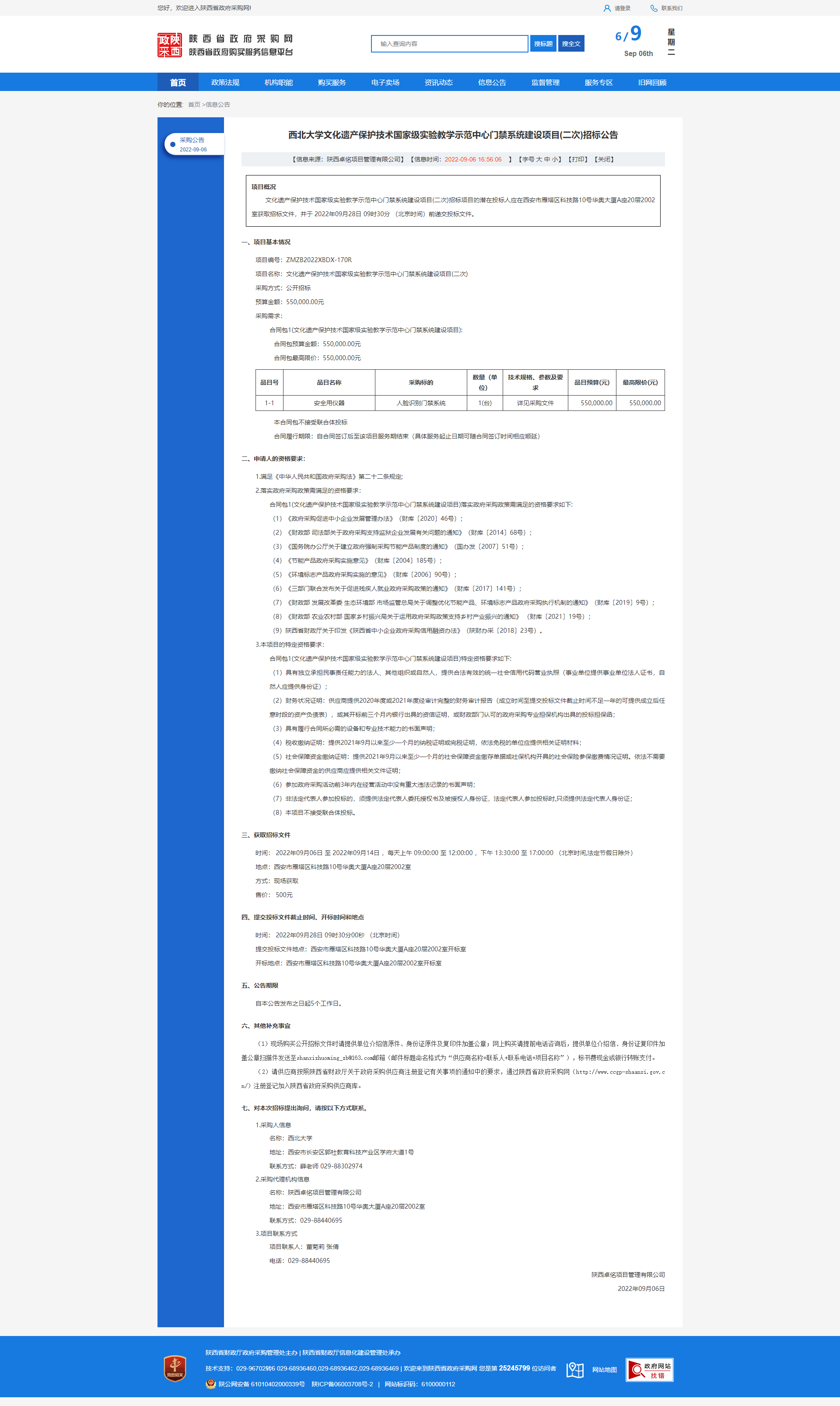 MILAN.COM文化遗产保护技术国家级实验教学示范中心门禁系统建设项目(二次)招标公告 作者: 编辑:采购与招标办公室 时间:2022-09-06 原公告链接:http://www.ccgp-shaanxi.gov.cn/freecms/site/shaanxi/ggxx/info/2022/8a69c63182a32538018311f9ef2e1370.html?noticeType=001011¬iceId=3d8b61ff-2dc2-11ed-9a8e-08c0eb20c666