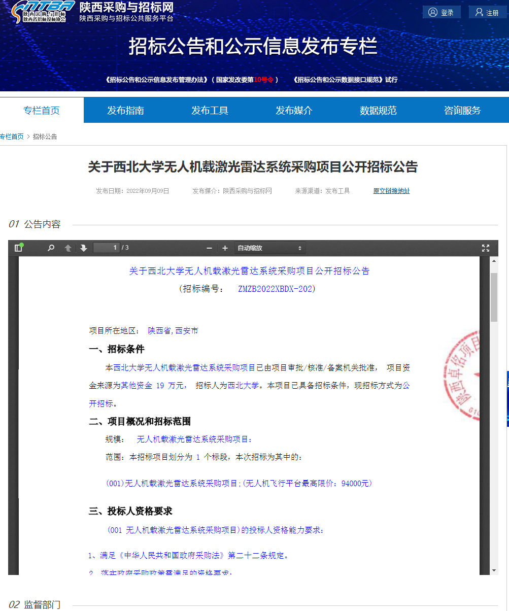 关于MILAN.COM无人机载激光雷达系统采购项目公开招标公告 作者: 编辑:关于MILAN.COM无人机载激光雷达系统采购项目公开招标公告 时间:2022-09-09 原公告链接:http://bulletin.sntba.com/biddingBulletin/2022-09-09/472755.html