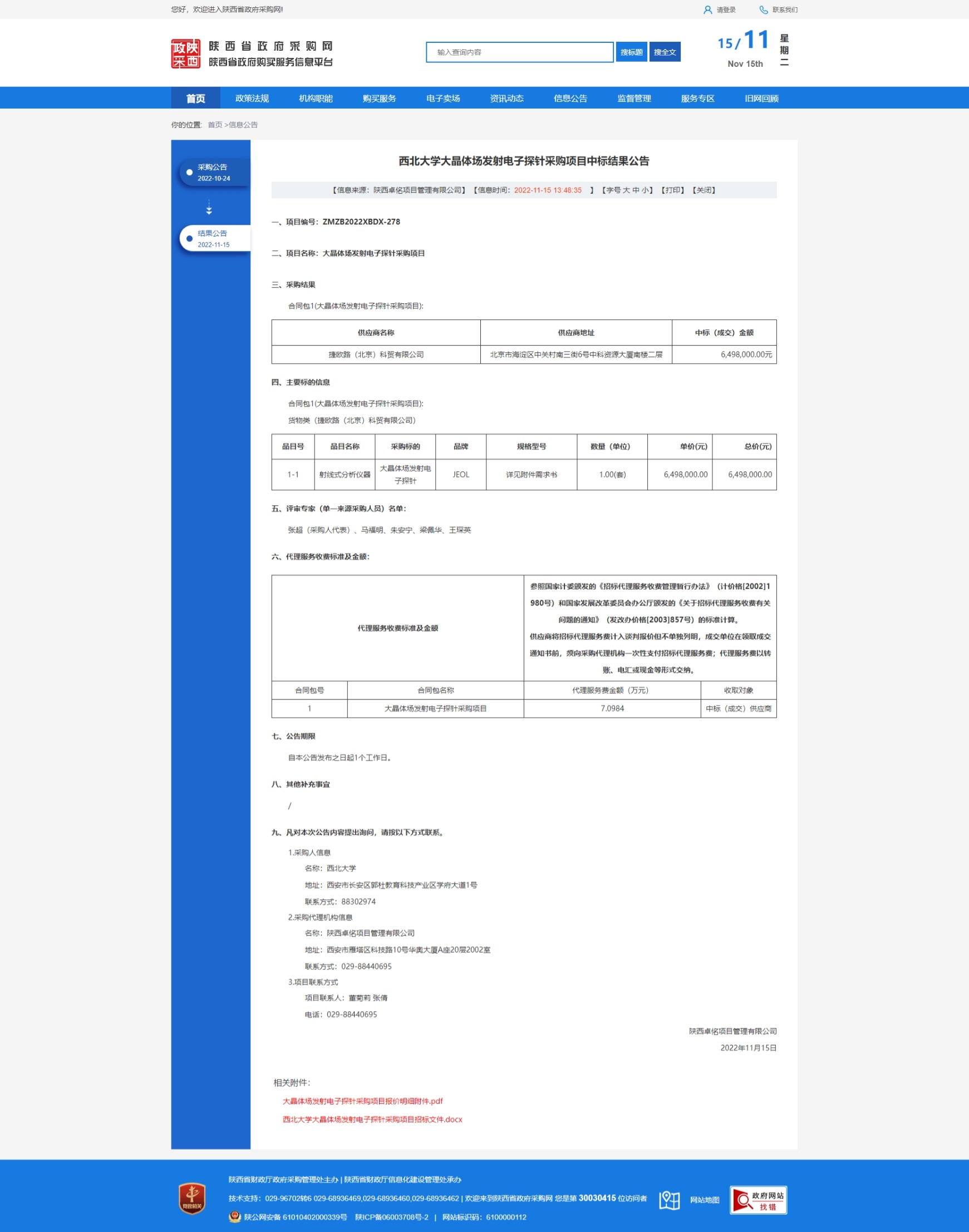 MILAN.COM大晶体场发射电子探针采购项目中标结果公告 作者: 编辑:采购与招标办公室 时间:2022-11-15 原公告链接:http://www.ccgp-shaanxi.gov.cn/freecms/site/shaanxi/ggxx/info/2022/8a69c1948405afd90184743164664c62.html?noticeType=001021¬iceId=c98b2ee6-64a9-11ed-9a8e-08c0eb20c666