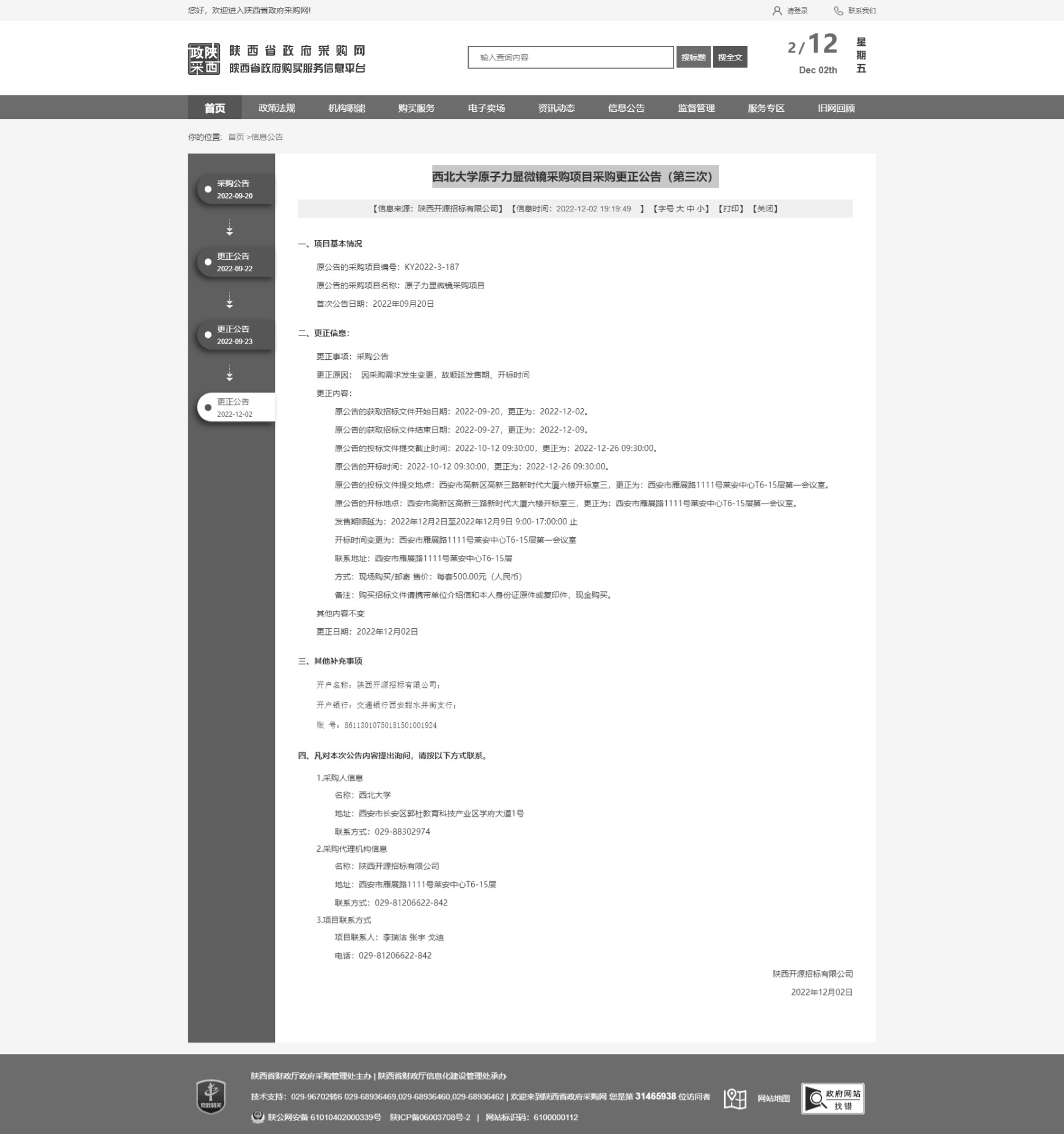 MILAN.COM原子力显微镜采购项目采购更正公告(第三次) 作者: 编辑:采购与招标办公室 时间:2022-12-02 原公告链接:http://www.ccgp-shaanxi.gov.cn/freecms/site/shaanxi/ggxx/info/2022/8a69c4c88405ac2f0184d27d406137d7.html?noticeType=001031¬iceId=e90e6533-7233-11ed-9a8e-08c0eb20c666