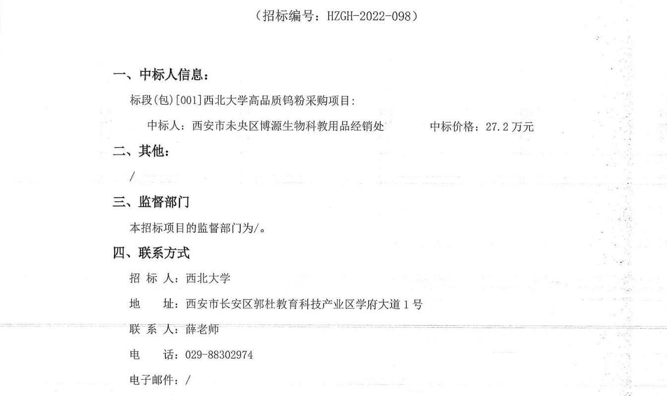 MILAN.COM高品质钨粉采购项目中标结果公示 作者: 编辑:采购与招标办公室 时间:2022-12-16 原公告链接:http://bulletin.sntba.com/resultBulletin/2022-12-16/511703.html