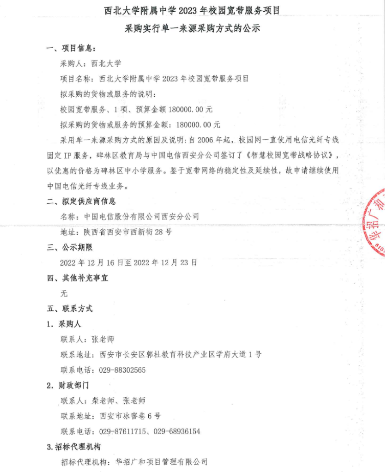 MILAN.COM附属中学2023年校园宽带服务项目采购实行单一来源采购方式的公示