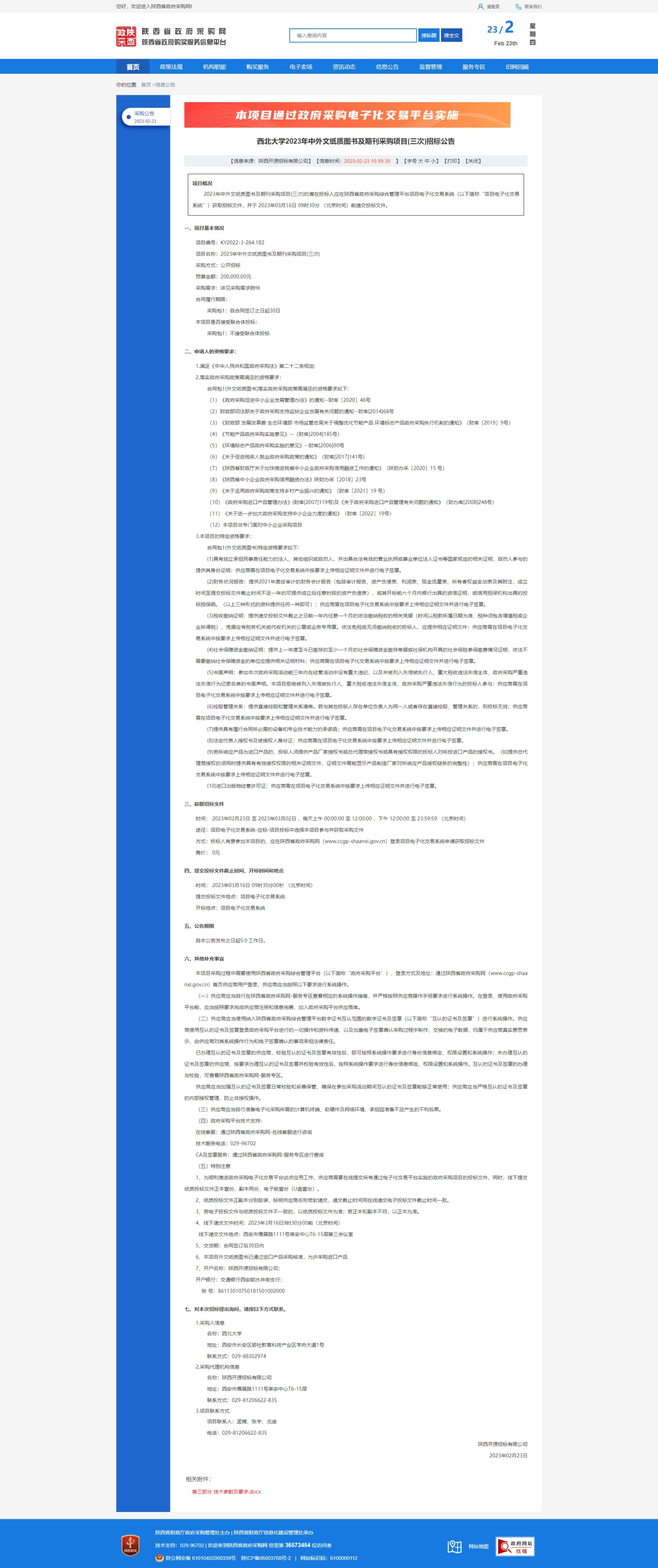 MILAN.COM2023年中外文纸质图书及期刊采购项目(三次)招标公告 作者: 编辑:采购与招标办公室 时间:2023-02-23 原公告链接:http://www.ccgp-shaanxi.gov.cn/freecms/site/shaanxi/ggxx/info/2023/8a69c672865ced8c01867d3e22983dee.html?noticeType=001011¬iceId=de2454c9-b350-11ed-9a8e-08c0eb20c666