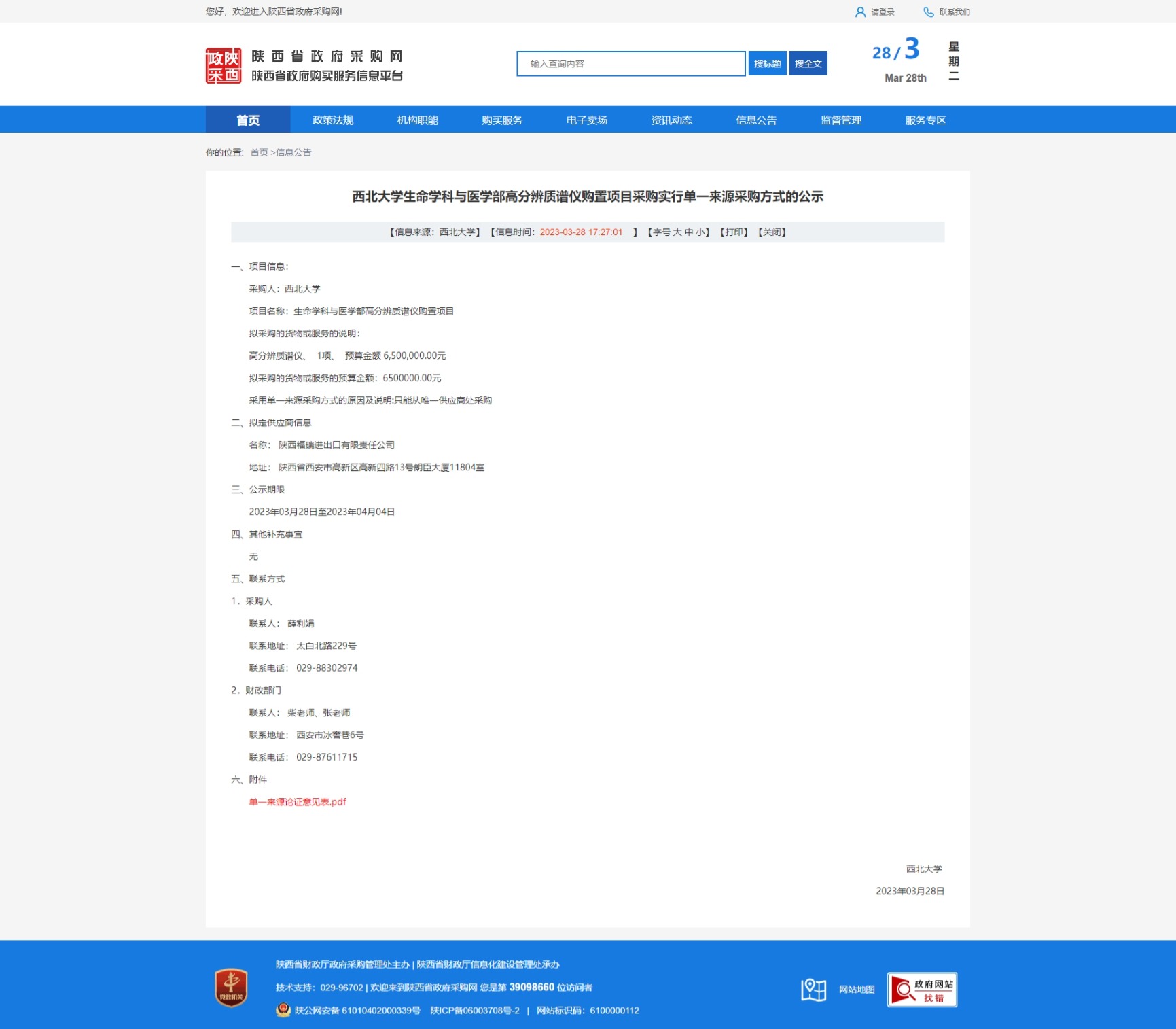 MILAN.COM生命学科与医学部高分辨质谱仪购置项目采购实行单一来源采购方式的公示 作者: 编辑:采购与招标办公室 时间:2023-03-28 原公告链接:http://www.ccgp-shaanxi.gov.cn/freecms/site/shaanxi/ggxx/info/2023/8a69c2018721d9cb018726d4460d78d5.html?noticeType=001051¬iceId=9b938696-cd4b-11ed-9a8e-08c0eb20c666