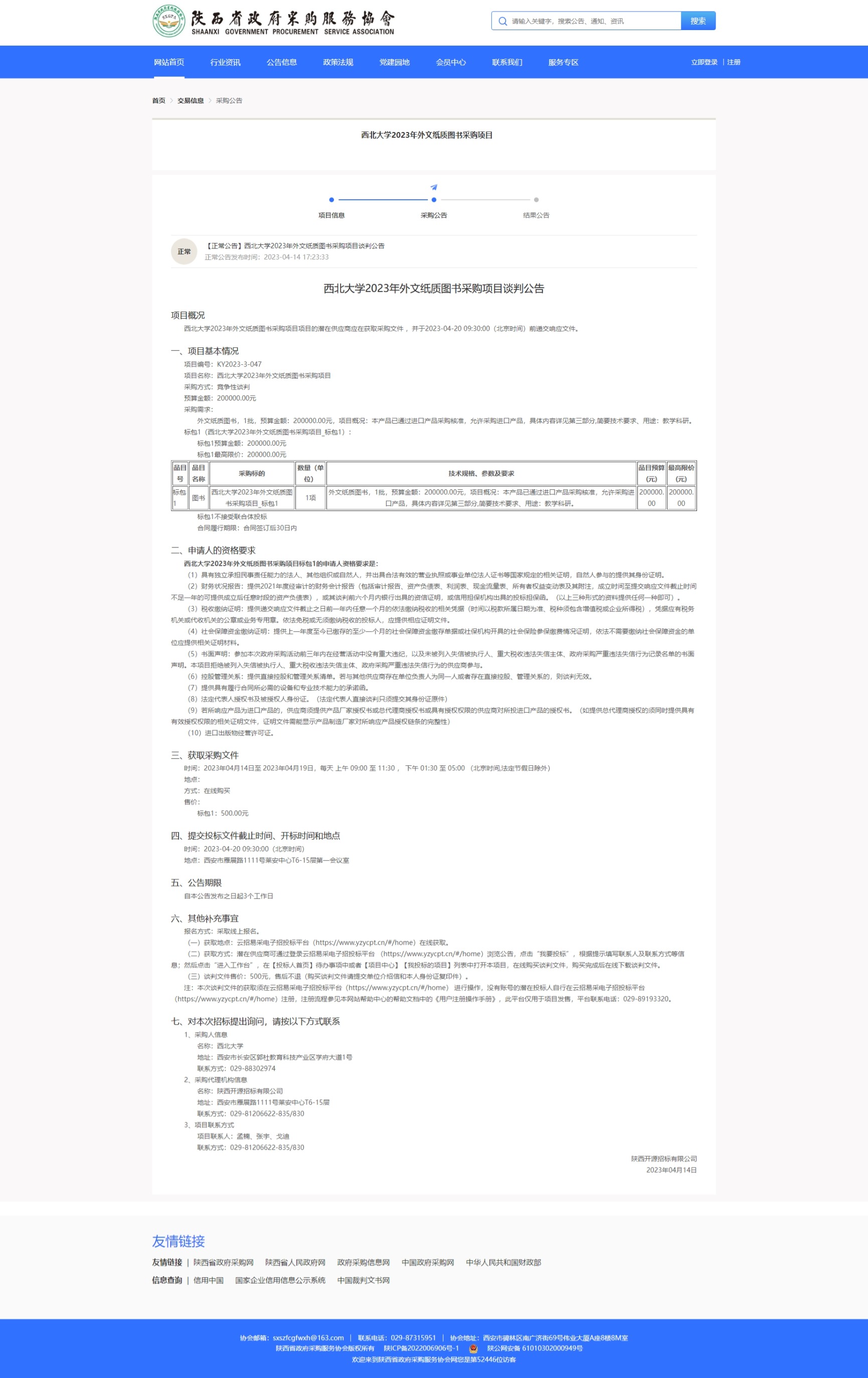 MILAN.COM2023年外文纸质图书采购项目谈判公告 作者: 编辑:采购与招标办公室 时间:2023-04-14 原公告链接:https://www.sxszfcgfwxh.cn/#/tender-vTradeAnnouncement-anno?tenderProjectId=1646805161369710594