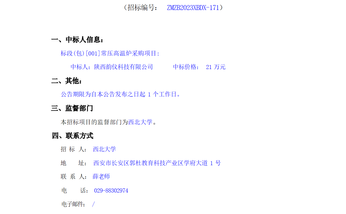 MILAN.COM常压高温炉采购项目结果公告 作者: 编辑:采购与招标办公室 时间:2023-08-01 原公告链接:http://bulletin.sntba.com/resultBulletin/2023-08-01/599542.html
