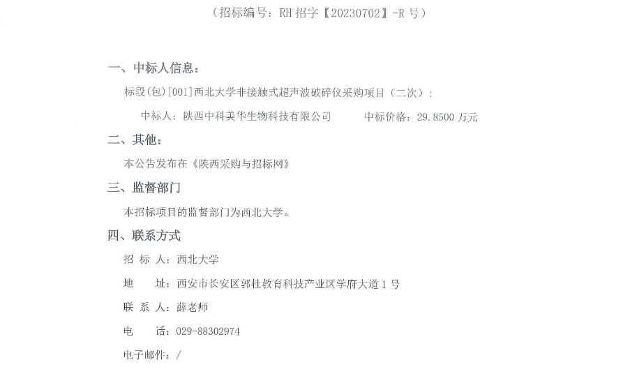 MILAN.COM非接触式超声波破碎仪采购项目(二次)中标结果公告 作者: 编辑:采购与招标办公室 时间:2023-10-10 原公告链接:http://bulletin.sntba.com/resultBulletin/2023-10-09/714535.html
