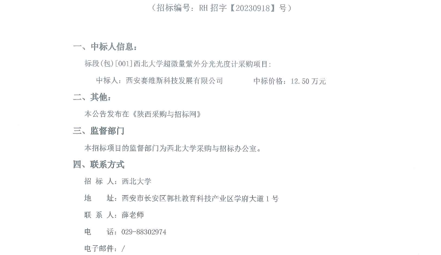 MILAN.COM超微量紫外分光光度计采购项目成交结果公告 作者: 编辑:采购与招标办公室 时间:2023-10-12 原公告链接:http://bulletin.sntba.com/resultBulletin/2023-10-12/722502.html