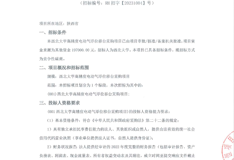 MILAN.COM高精度电动气浮位移台采购项目竞争性磋商公告 作者: 编辑:采购与招标办公室 时间:2023-10-18 原公告链接:http://bulletin.sntba.com/biddingBulletin/2023-10-17/735313.html