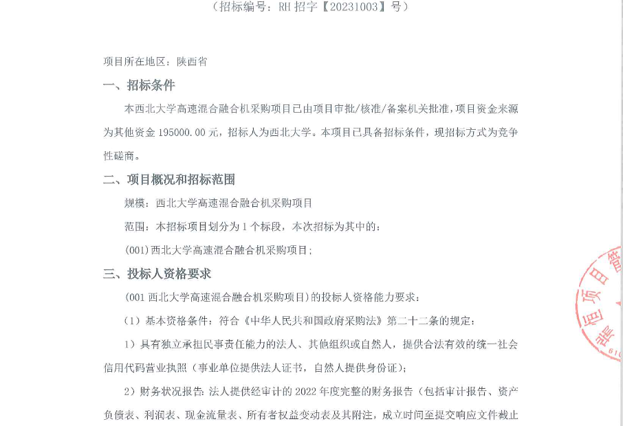 MILAN.COM高速混合融合机采购项目竞争性磋商公告 作者: 编辑:采购与招标办公室 时间:2023-10-18 原公告链接:http://bulletin.sntba.com/biddingBulletin/2023-10-17/735312.html