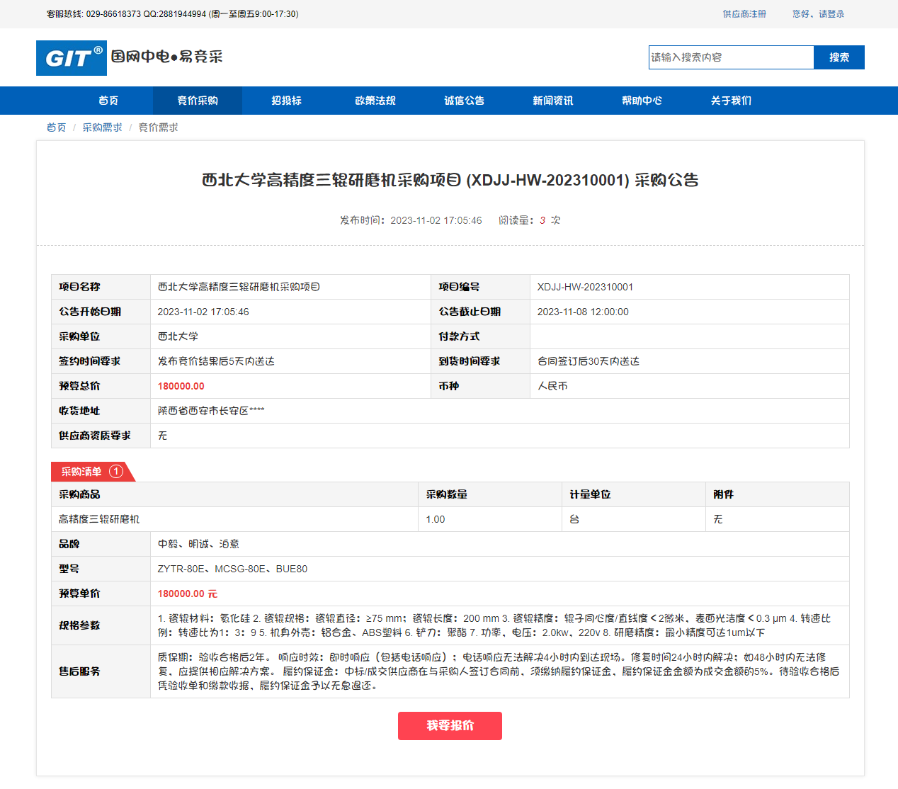 MILAN.COM高精度三辊研磨机采购项目竞价公告