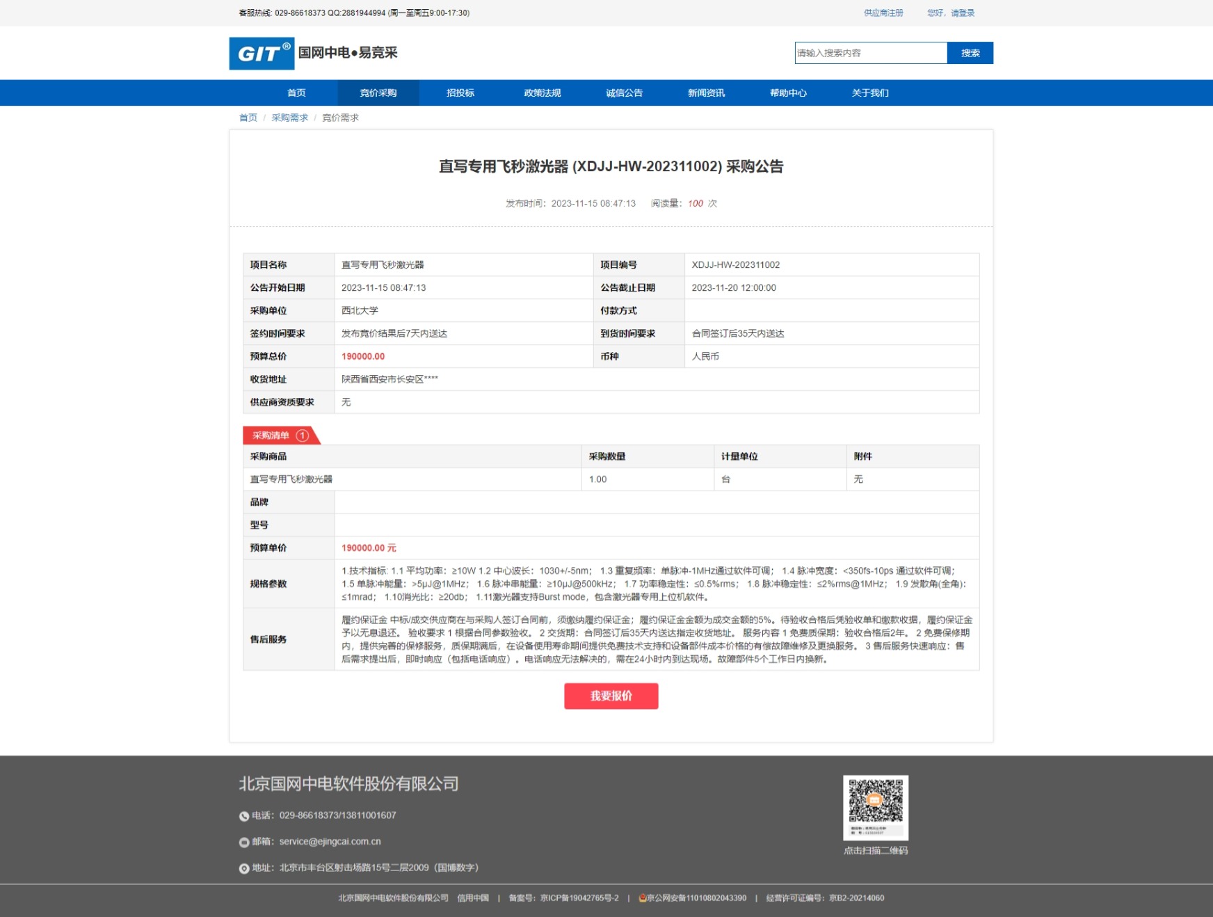 MILAN.COM直写专用飞秒激光器采购公告 作者: 编辑:采购与招标办公室 时间:2023-11-15 原公告链接:https://www.ejingcai.com.cn/site/bidding/detail/6692