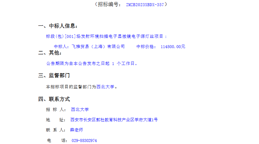 MILAN.COM场发射环境扫描电子显微镜电子源灯丝项目采购结果公告 作者: 编辑:采购与招标办公室 时间:2023-12-14 原公告链接:http://www.sntba.com/website/gg_show.aspx?id=263188
