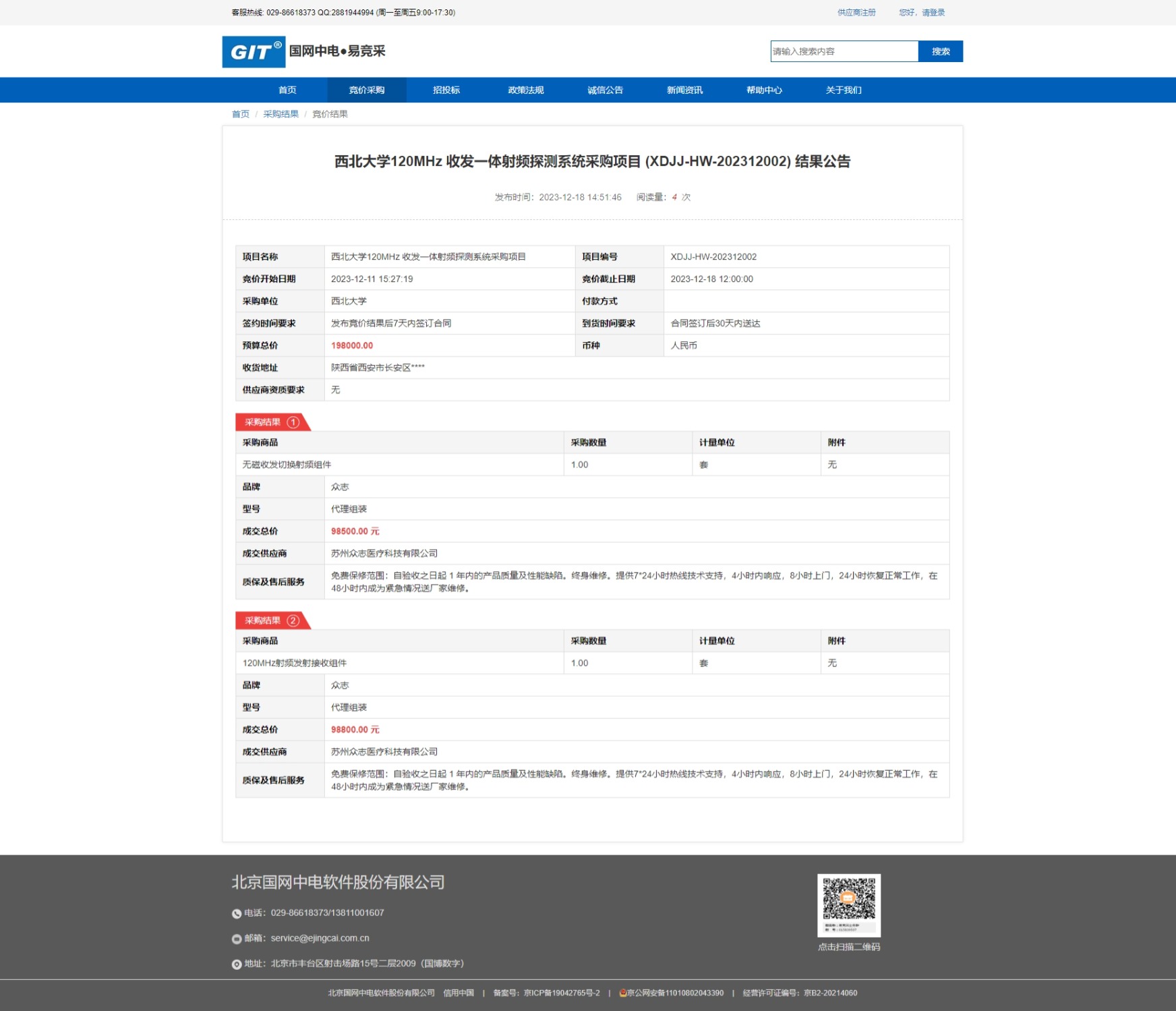 MILAN.COM120MHz 收发一体射频探测系统采购项目 (XDJJ-HW-202312002) 结果公告 作者: 编辑:采购与招标办公室 时间:2023-12-18 原公告链接:https://www.ejingcai.com.cn/site/bidding/detail/7902