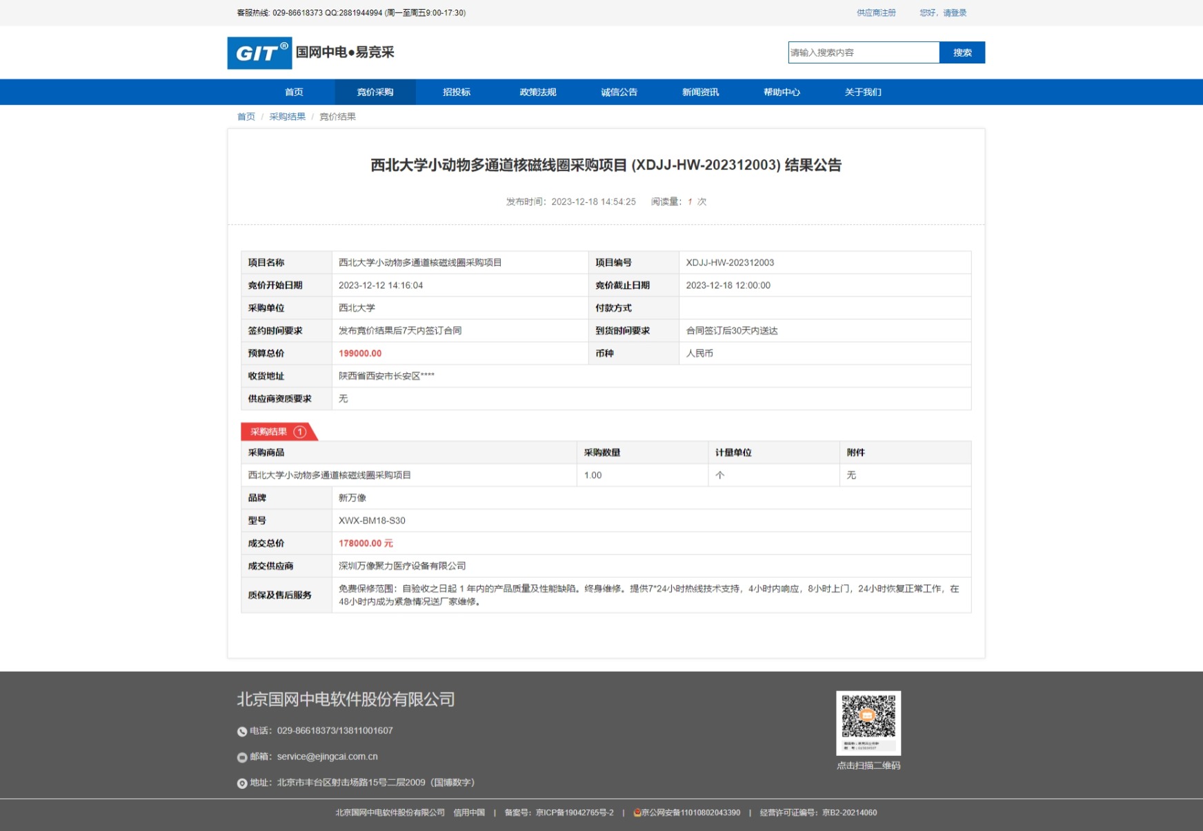 MILAN.COM小动物多通道核磁线圈采购项目 (XDJJ-HW-202312003) 结果公告 作者: 编辑:采购与招标办公室 时间:2023-12-18 原公告链接:https://www.ejingcai.com.cn/site/bidding/detail/7904
