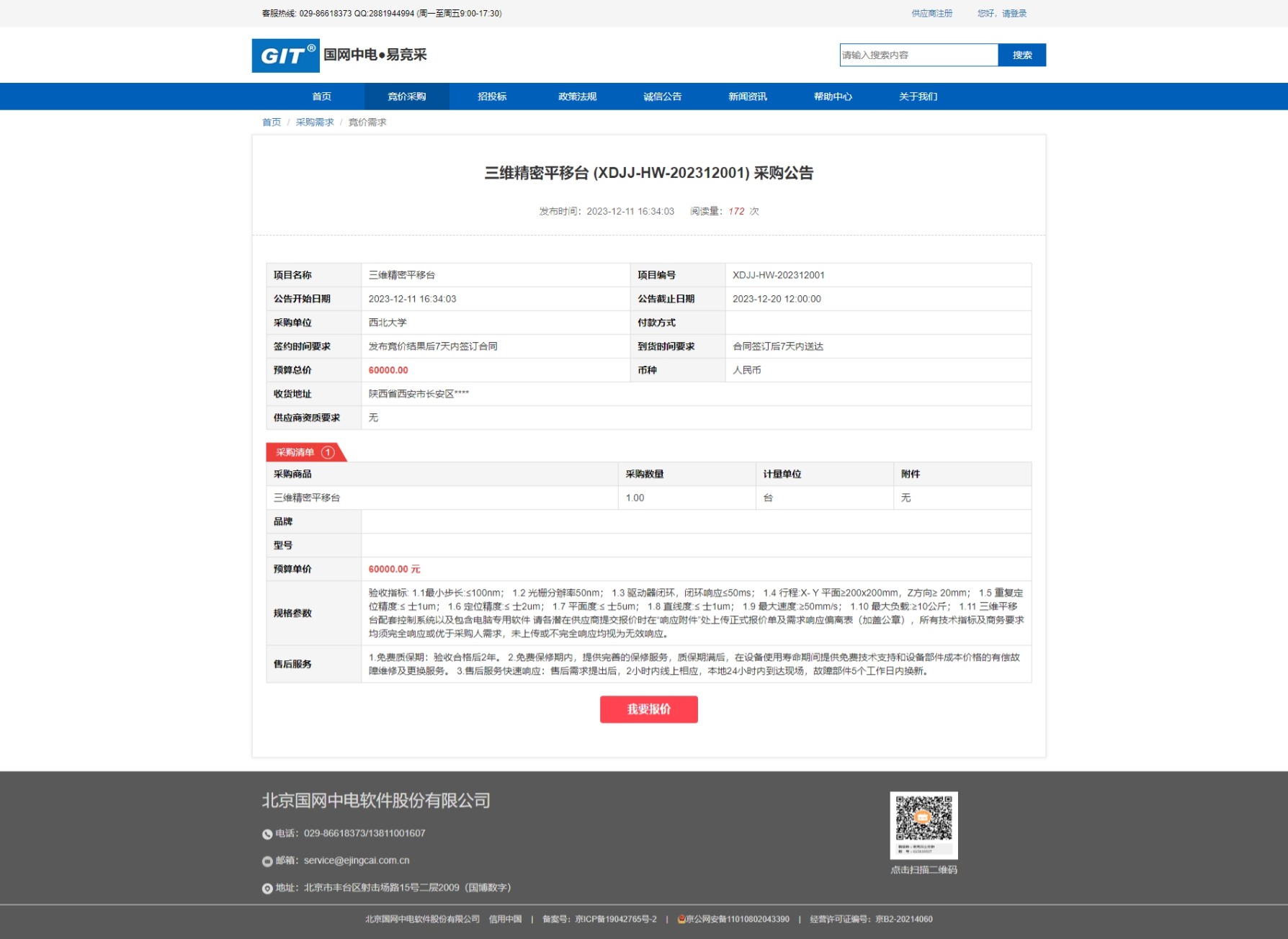 MILAN.COM三维精密平移台 (XDJJ-HW-202312001) 采购公告 作者: 编辑:王雯岚 时间:2023-12-19 原公告链接:https://www.ejingcai.com.cn/site/bidding/detail/7727