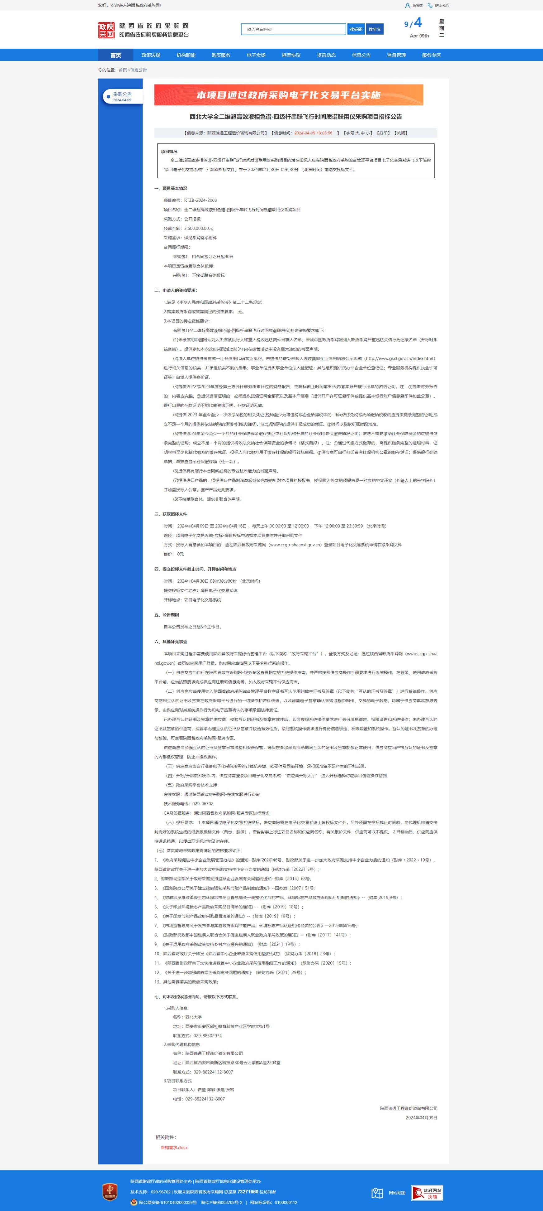 MILAN.COM全二维超高效液相色谱-四级杆串联飞行时间质谱联用仪采购项目招标公告 作者: 编辑:采购与招标办公室 时间:2024-04-09 原公告链接:https://www.ccgp-shaanxi.gov.cn/freecms/site/shaanxi/ggxx/info/2024/8a69c8ad8e463f10018ec11376b17a0a.html?noticeType=001011¬iceId=bd9af3a2-f62f-11ee-b8b6-08c0eb20c666