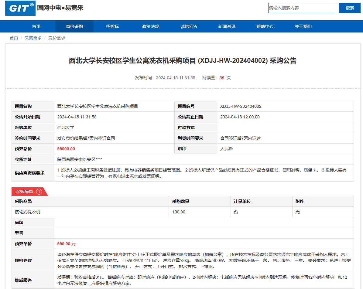 MILAN.COM长安校区学生公寓洗衣机采购项目 (XDJJ-HW-202404002) 竞价公告 作者: 编辑: 时间:2024-04-16 原公告链接:https://www.ejingcai.com.cn/site/bidding/detail/9485