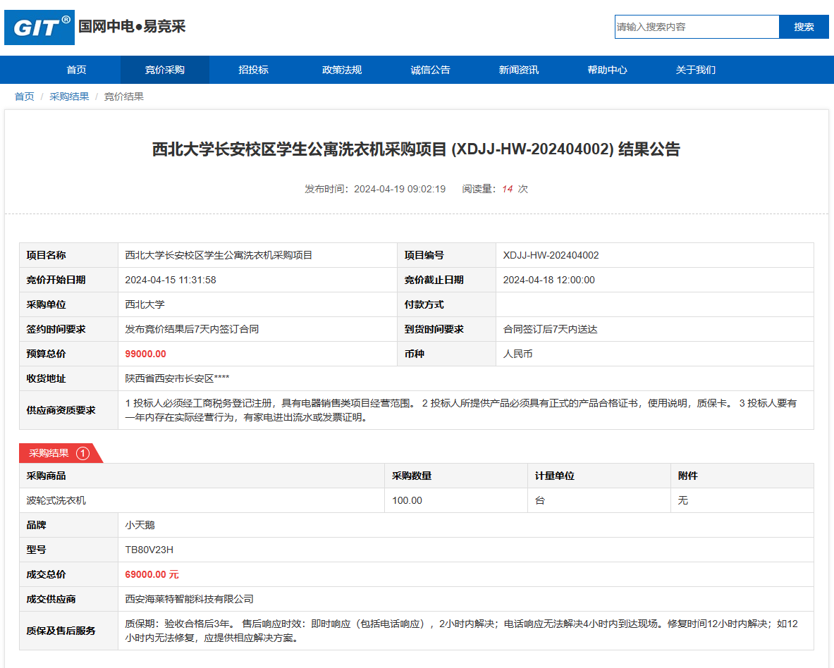 MILAN.COM长安校区学生公寓洗衣机采购项目 (XDJJ-HW-202404002) 竞价结果公告 作者: 编辑: 时间:2024-04-19 原公告链接:https://www.ejingcai.com.cn/site/bidding/detail/9576