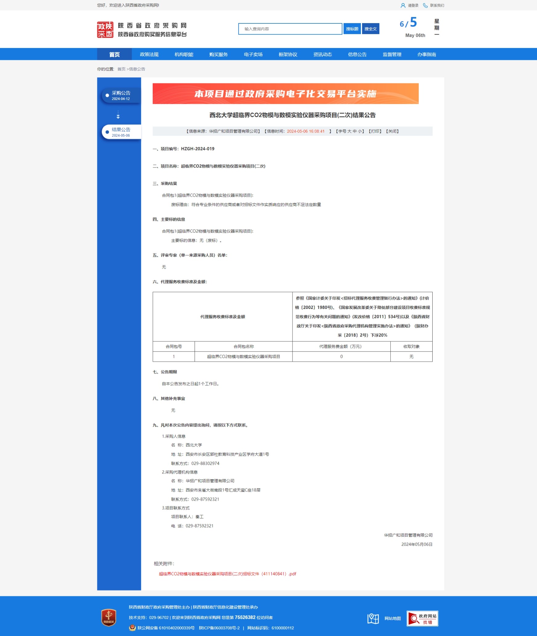 MILAN.COM超临界CO2物模与数模实验仪器采购项目(二次)结果公告 作者: 编辑:采购与招标办公室 时间:2024-05-06 原公告链接:https://www.ccgp-shaanxi.gov.cn/freecms/site/shaanxi/ggxx/info/2024/8a69c7f58e463d37018f4be929f13bcc.html?noticeType=001006¬iceId=82f86605-0b81-11ef-b8b6-08c0eb20c666