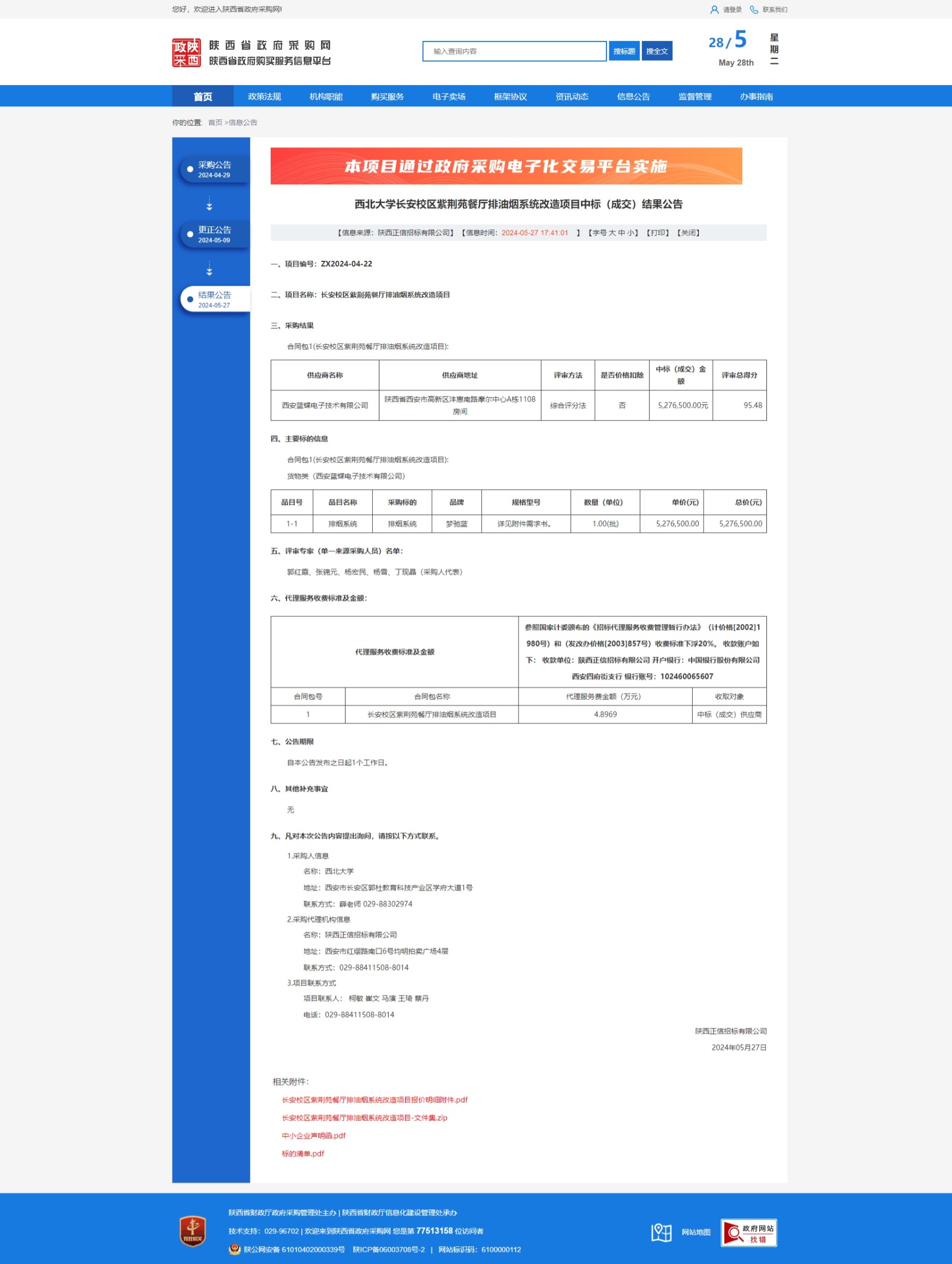 MILAN.COM长安校区紫荆苑餐厅排油烟系统改造项目中标(成交)结果公告 作者: 编辑:采购与招标办公室 时间:2024-05-28 原公告链接:https://www.ccgp-shaanxi.gov.cn/freecms/site/shaanxi/ggxx/info/2024/8a69c2108f8bd852018fb91b486c4125.html?noticeType=001021¬iceId=d54daf1e-1c10-11ef-b8b6-08c0eb20c666
