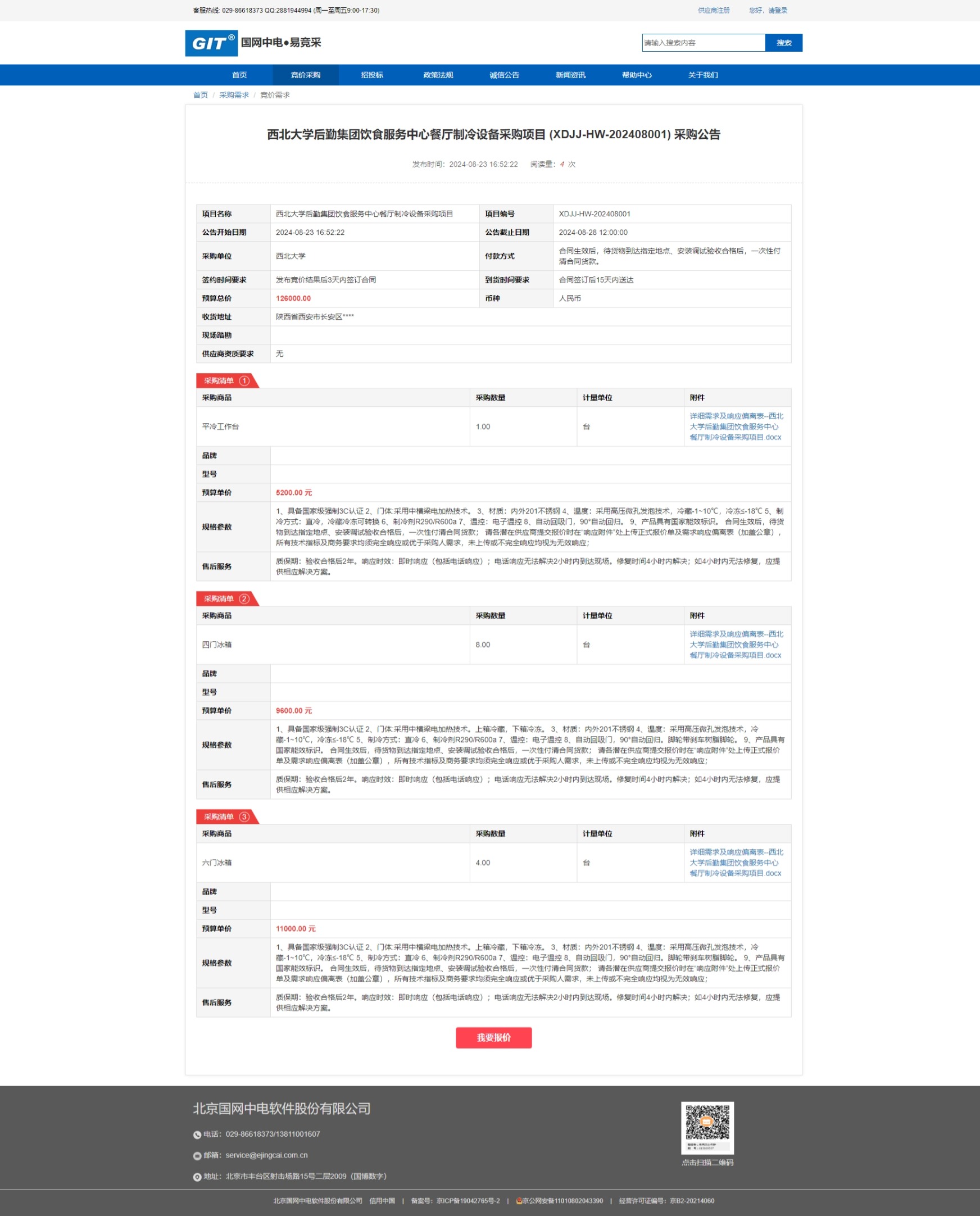 MILAN.COM后勤集团饮食服务中心餐厅制冷设备采购项目 (XDJJ-HW-202408001) 竞价公告 作者: 编辑:采购与招标办公室 时间:2024-08-23 原公告链接:https://www.ejingcai.com.cn/site/bidding/detail/12189