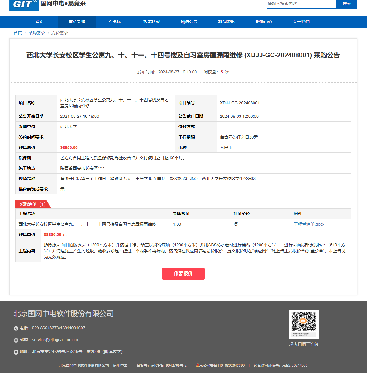 MILAN.COM长安校区学生公寓九、十、十一、十四号楼及自习室房屋漏雨维修 (XDJJ-GC-202408001) 竞价采购公告 作者: 编辑: 时间:2024-08-27 原公告链接:https://www.ejingcai.com.cn/site/bidding/detail/12232