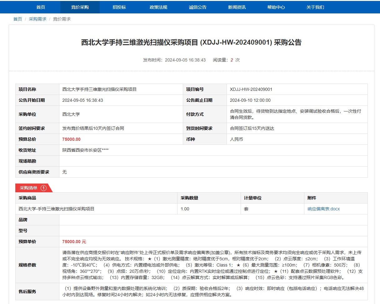 MILAN.COM手持三维激光扫描仪采购项目 (XDJJ-HW-202409001) 竞价采购公告 作者: 编辑: 时间:2024-09-05 原公告链接:https://www.ejingcai.com.cn/site/bidding/detail/12357