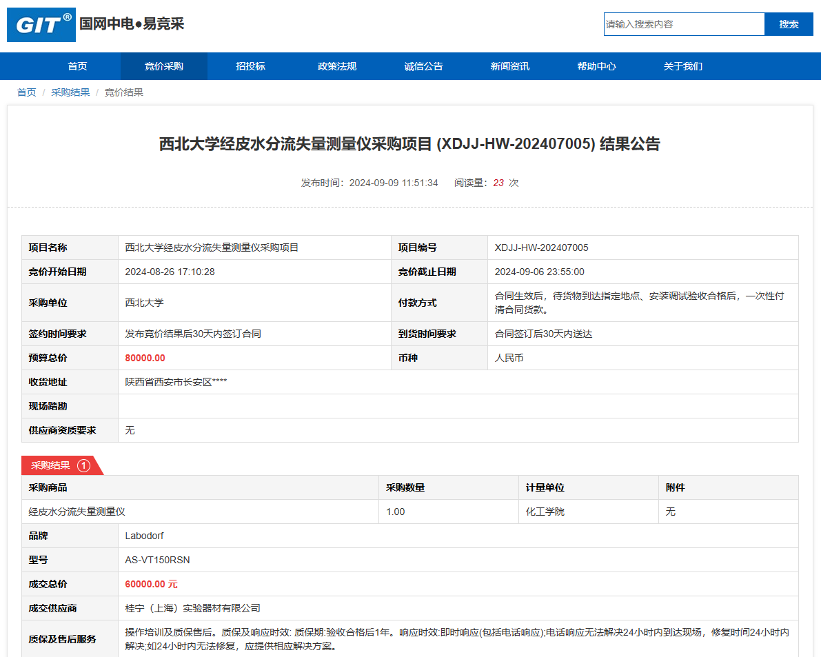 MILAN.COM经皮水分流失量测量仪采购项目 (XDJJ-HW-202407005) 竞价结果公告 作者: 编辑: 时间:2024-09-09 原公告链接:https://www.ejingcai.com.cn/site/bidding/detail/12405