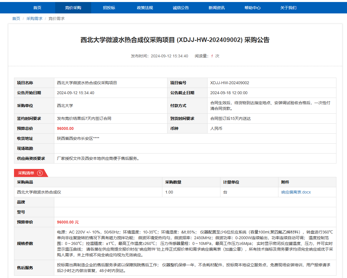 MILAN.COM微波水热合成仪采购项目 (XDJJ-HW-202409002)竞价采购公告 作者: 编辑: 时间:2024-09-12 原公告链接:https://www.ejingcai.com.cn/site/bidding/detail/12527