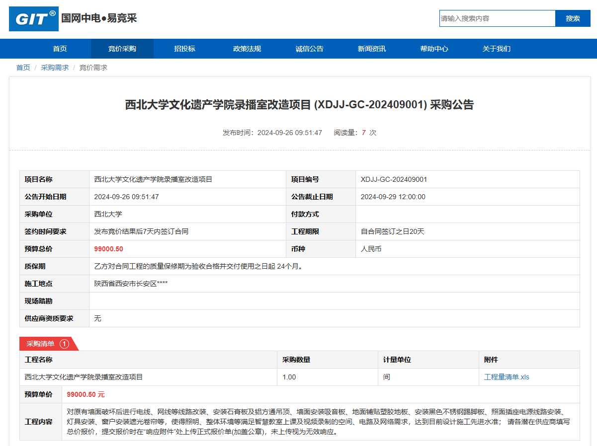 MILAN.COM文化遗产学院录播室改造项目 (XDJJ-GC-202409001)竞价采购公告 作者: 编辑: 时间:2024-09-26 原公告链接:https://www.ejingcai.com.cn/site/bidding/detail/12907