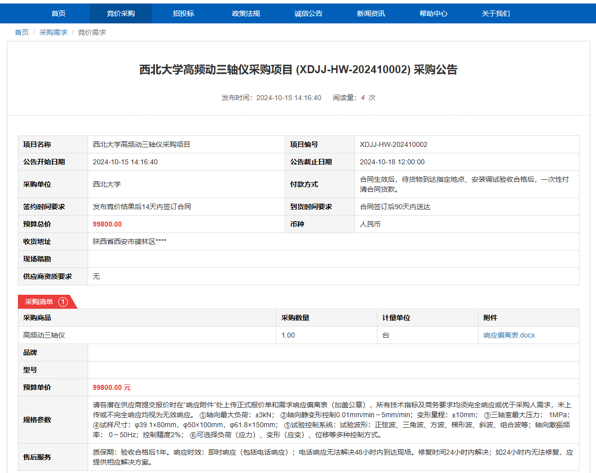 MILAN.COM高频动三轴仪采购项目(XDJJ-HW-202410002)竞价采购公告 作者:采购与招标办公室 编辑: 时间:2024-10-15 原公告链接:https://www.ejingcai.com.cn/site/bidding/detail/13317