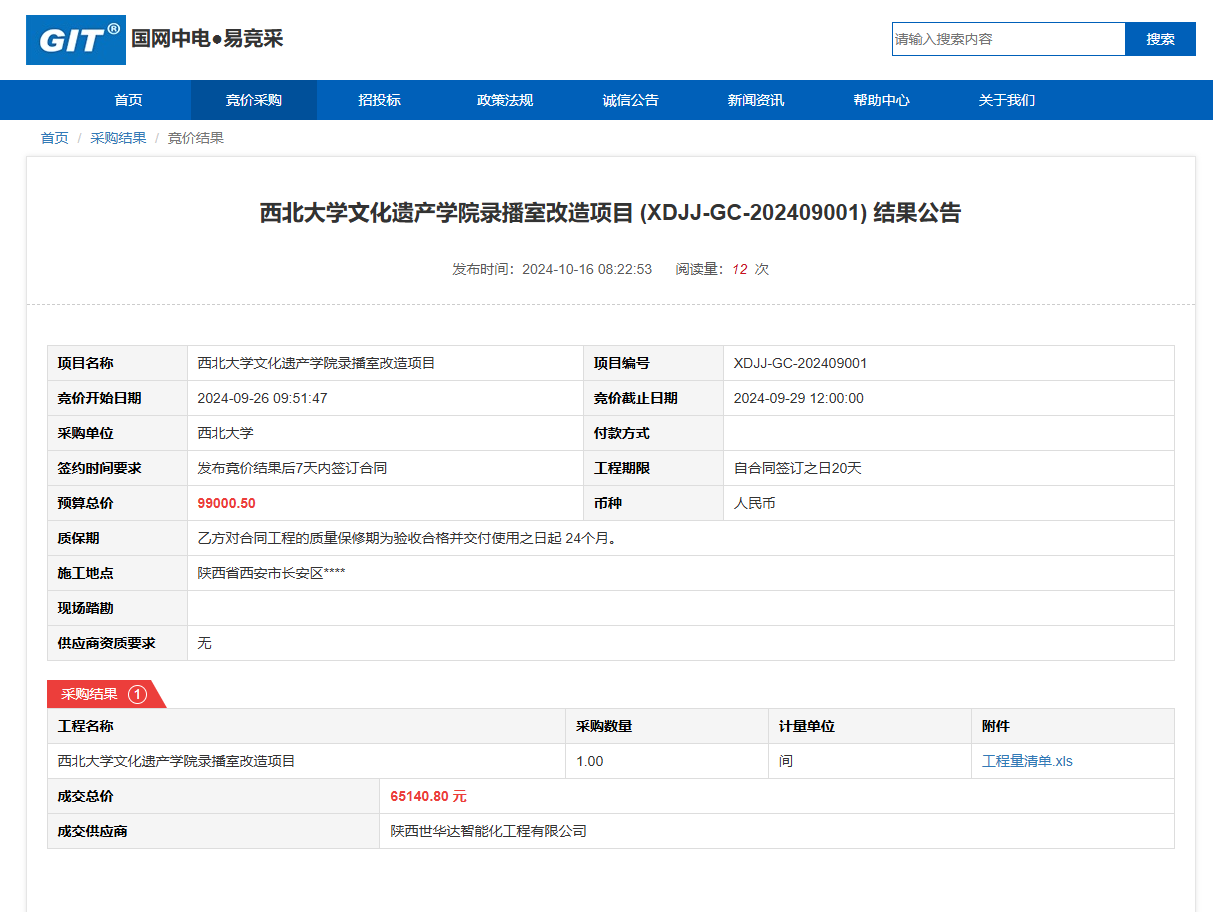 MILAN.COM文化遗产学院录播室改造项目(XDJJ-GC-202409001)竞价结果公告 作者:采购与招标办公室 编辑: 时间:2024-10-16 原公告链接:https://www.ejingcai.com.cn/site/bidding/detail/13343