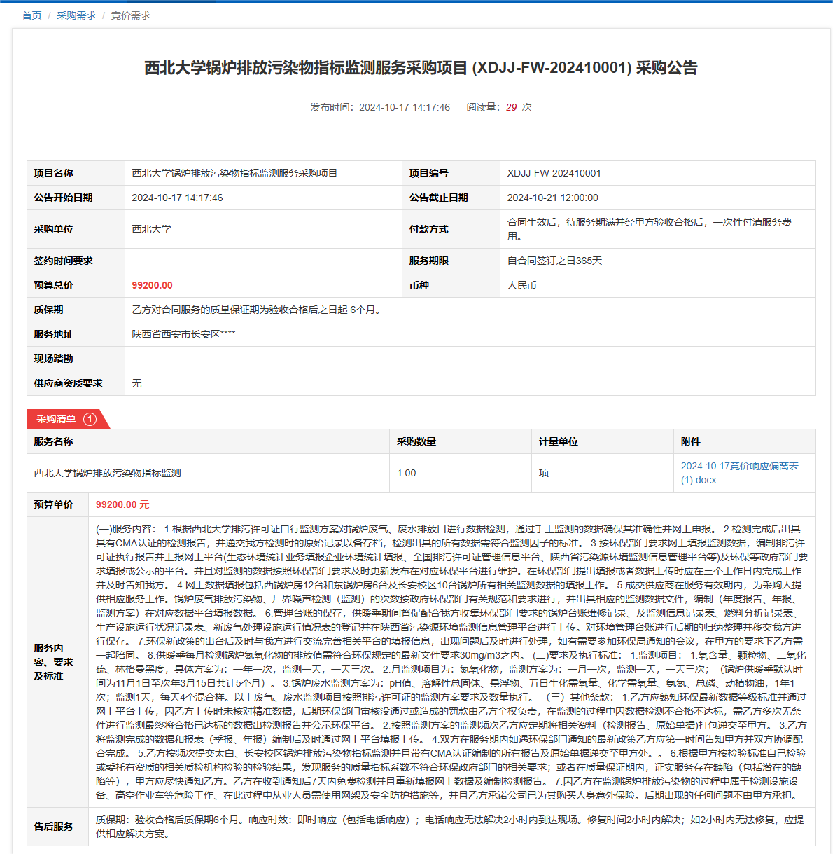 MILAN.COM锅炉排放污染物指标监测服务采购项目(XDJJ-FW-202410001)竞价采购公告 作者:采购与招标办公室 编辑: 时间:2024-10-18 原公告链接:https://www.ejingcai.com.cn/site/bidding/detail/13425